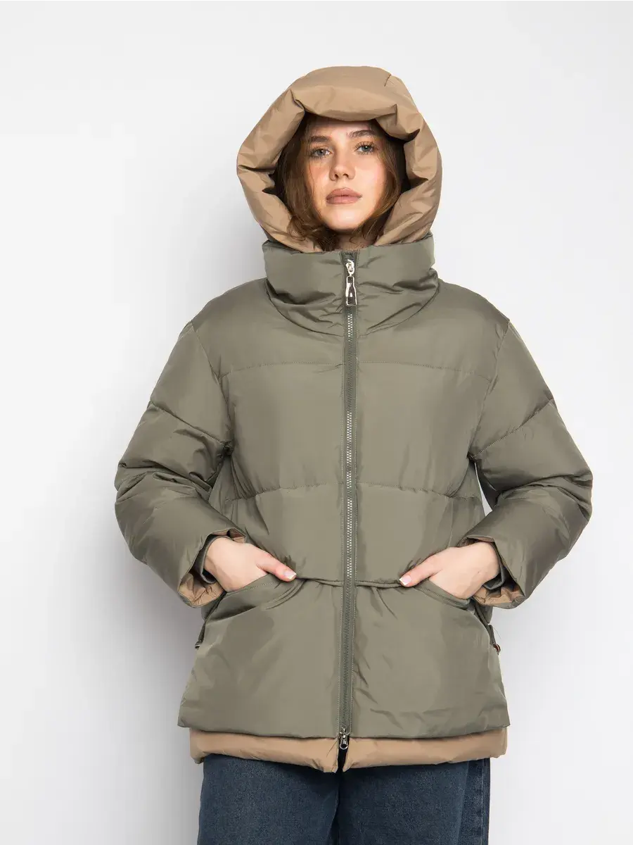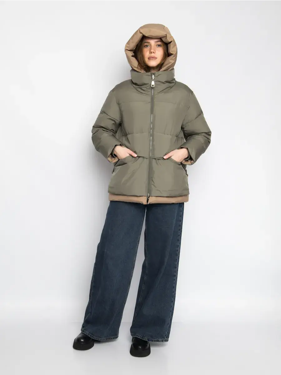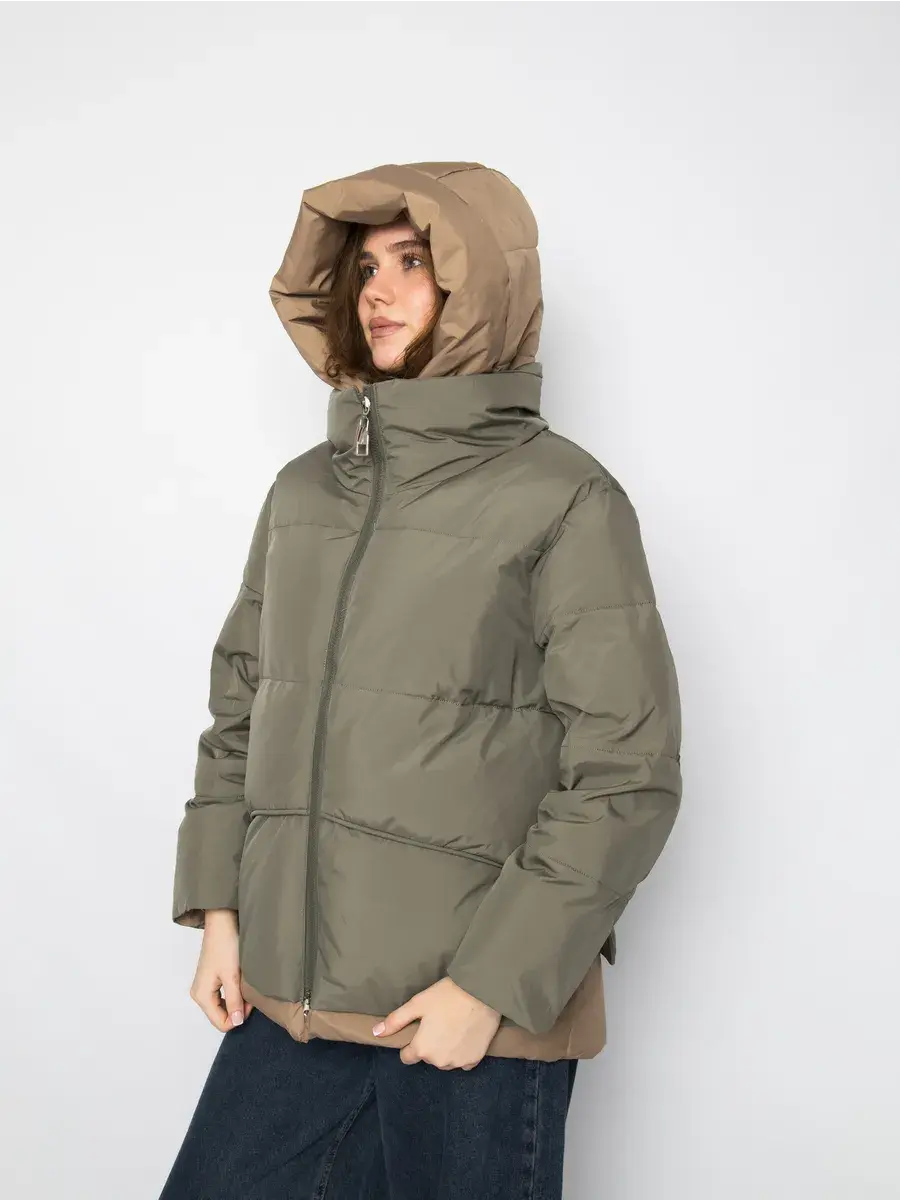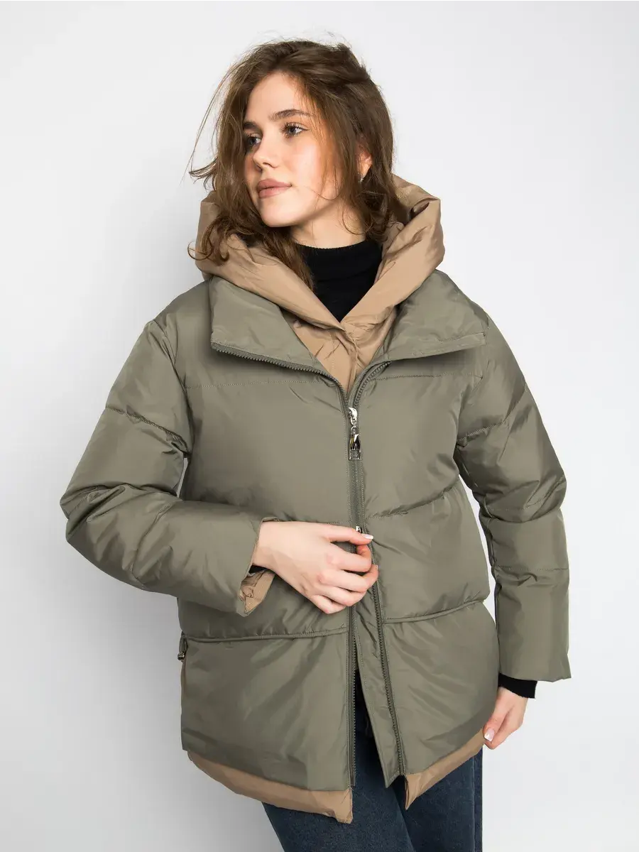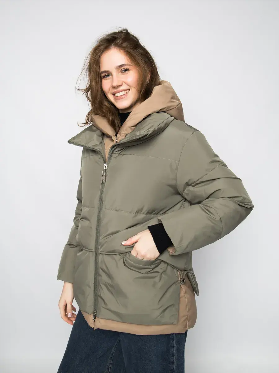 Куртка зимняя женская - это стильное и практичное решение для холодного сезона. Модель выполнена из полиэстера с гладкой фактурой и утеплена холлофайбером, что обеспечивает комфорт при низких температурах. Укороченный покрой и модный оверсайз силуэт придают куртке современный вид, а двухцветная расцветка в бежевом и оливковом тонах делает ее универсальной для создания различных образов. Модель оснащена удобной застежкой на молнии и кнопках, а также несъемным капюшоном, который защитит от ветра и снега. Прорезные карманы на молнии позволят удобно хранить необходимые мелочи. Данный пуховик - это идеальный выбор для активных женщин и девушек, которые ценят комфорт, стиль и практичность.