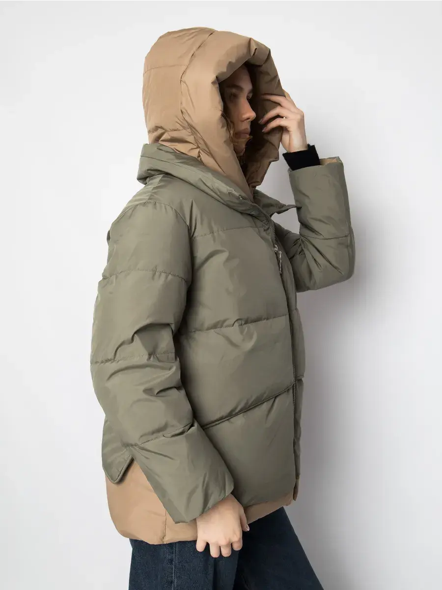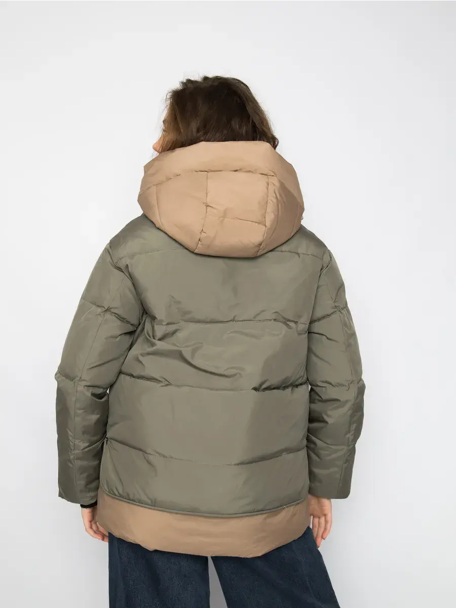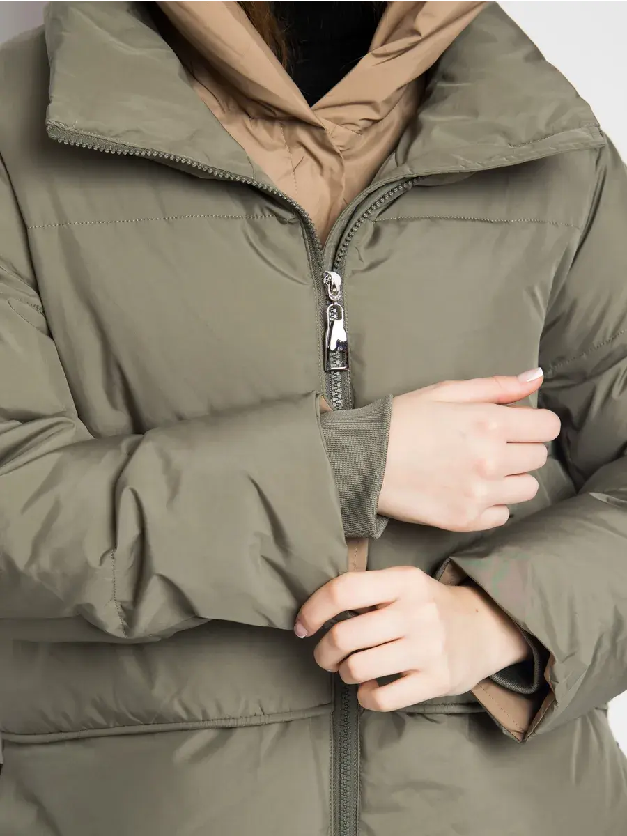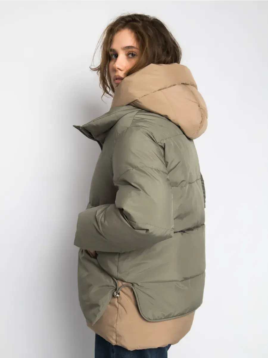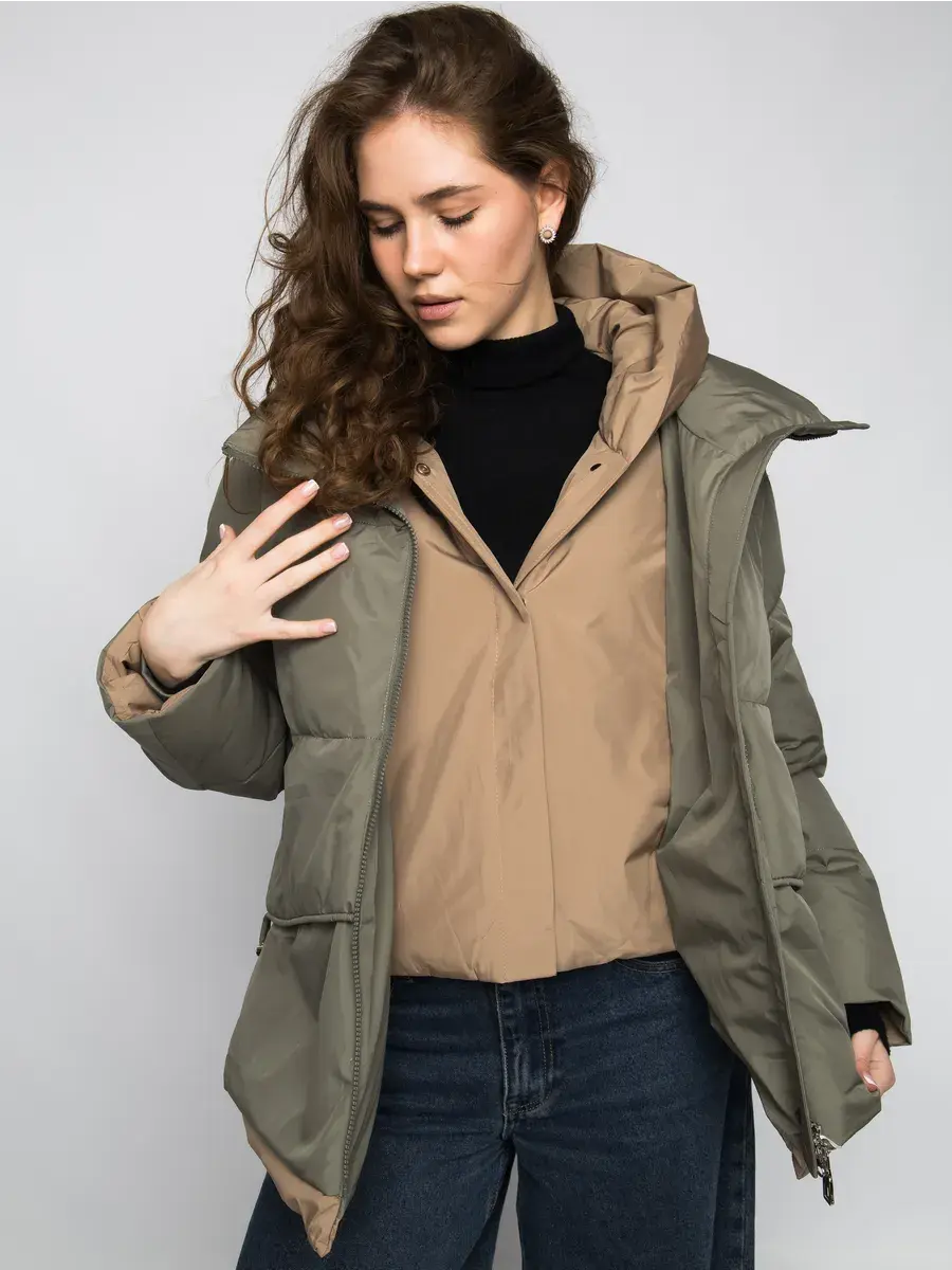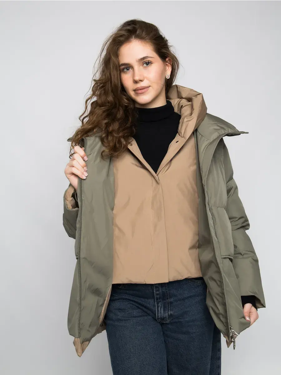 Куртка зимняя женская - это стильное и практичное решение для холодного сезона. Модель выполнена из полиэстера с гладкой фактурой и утеплена холлофайбером, что обеспечивает комфорт при низких температурах. Укороченный покрой и модный оверсайз силуэт придают куртке современный вид, а двухцветная расцветка в бежевом и оливковом тонах делает ее универсальной для создания различных образов. Модель оснащена удобной застежкой на молнии и кнопках, а также несъемным капюшоном, который защитит от ветра и снега. Прорезные карманы на молнии позволят удобно хранить необходимые мелочи. Данный пуховик - это идеальный выбор для активных женщин и девушек, которые ценят комфорт, стиль и практичность.