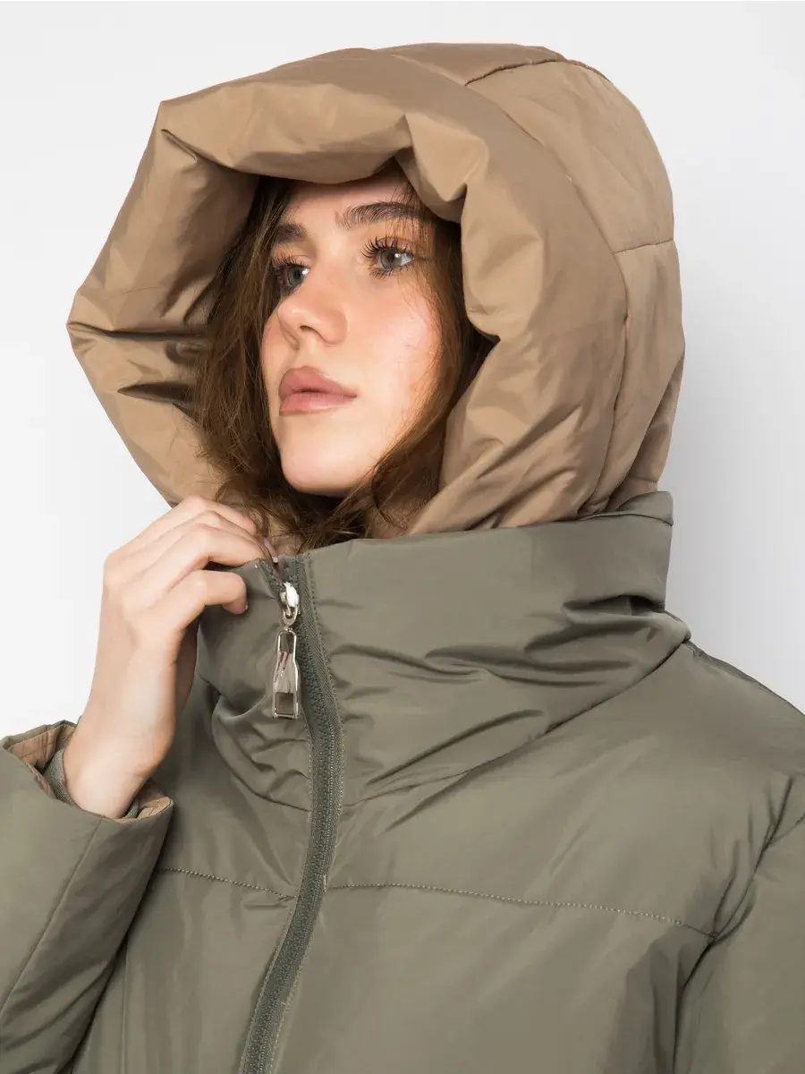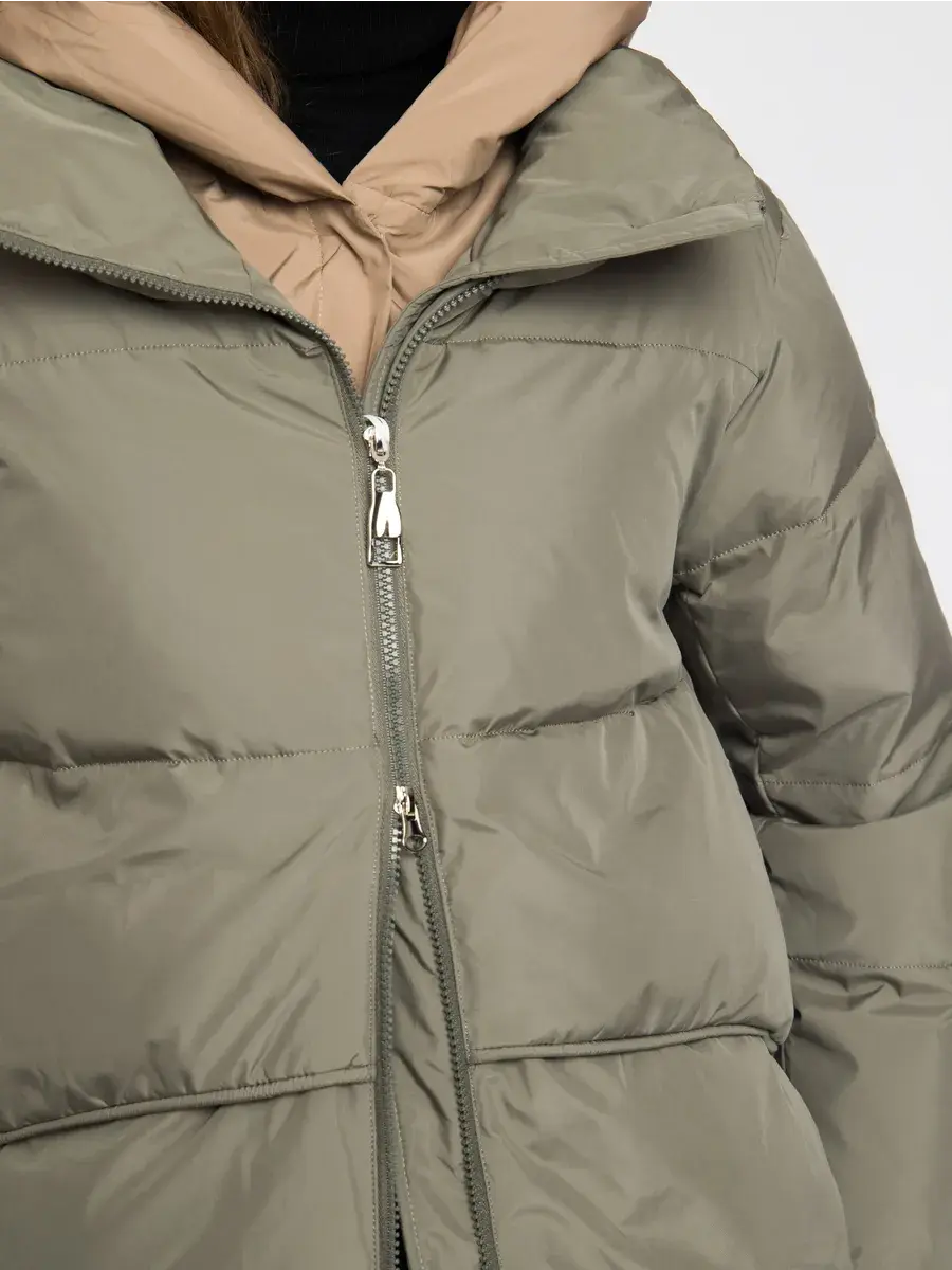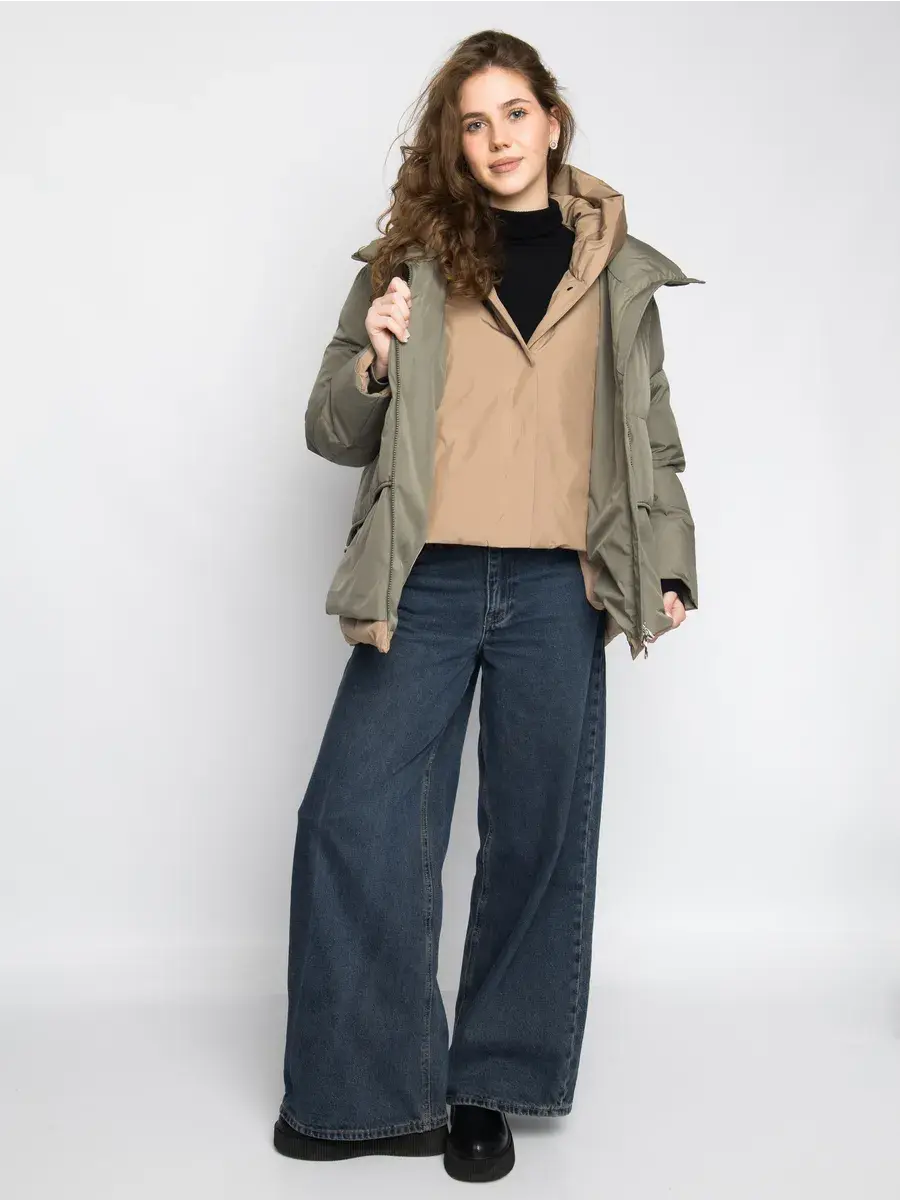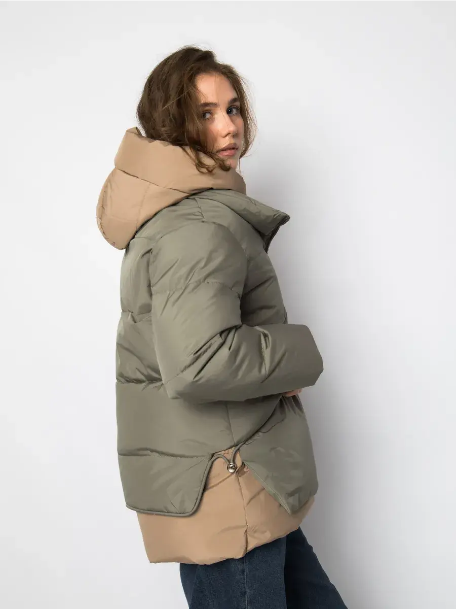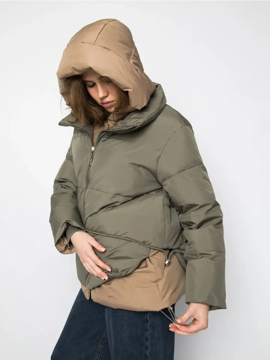 Куртка зимняя женская - это стильное и практичное решение для холодного сезона. Модель выполнена из полиэстера с гладкой фактурой и утеплена холлофайбером, что обеспечивает комфорт при низких температурах. Укороченный покрой и модный оверсайз силуэт придают куртке современный вид, а двухцветная расцветка в бежевом и оливковом тонах делает ее универсальной для создания различных образов. Модель оснащена удобной застежкой на молнии и кнопках, а также несъемным капюшоном, который защитит от ветра и снега. Прорезные карманы на молнии позволят удобно хранить необходимые мелочи. Данный пуховик - это идеальный выбор для активных женщин и девушек, которые ценят комфорт, стиль и практичность.