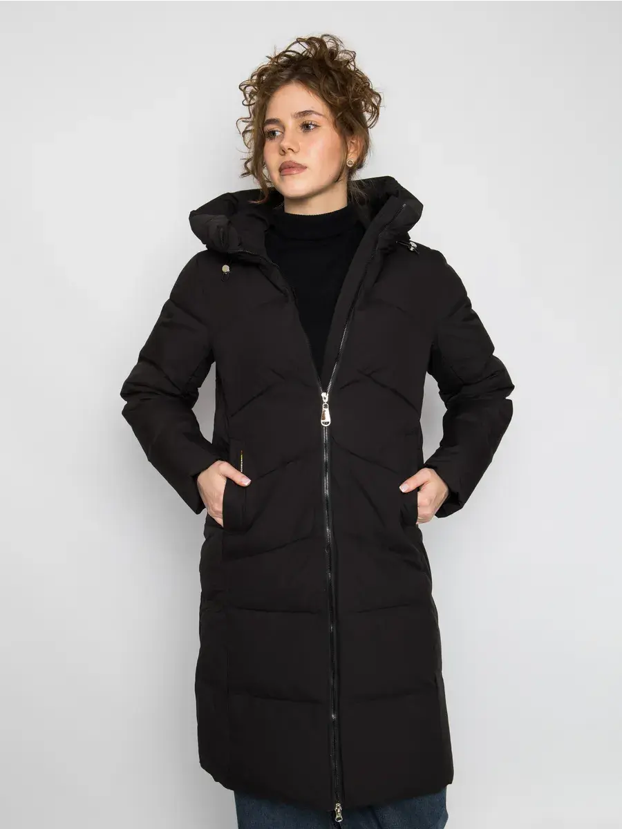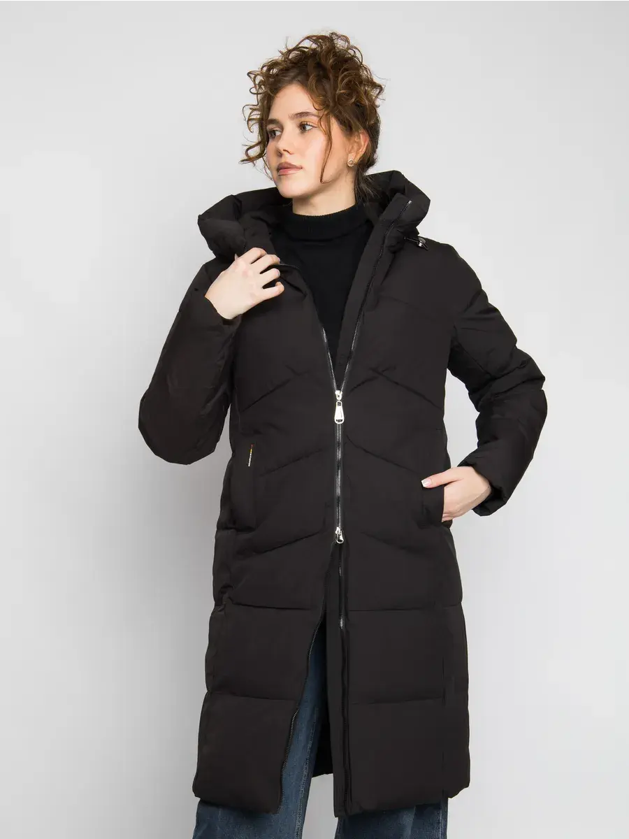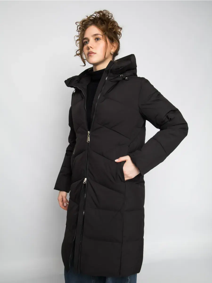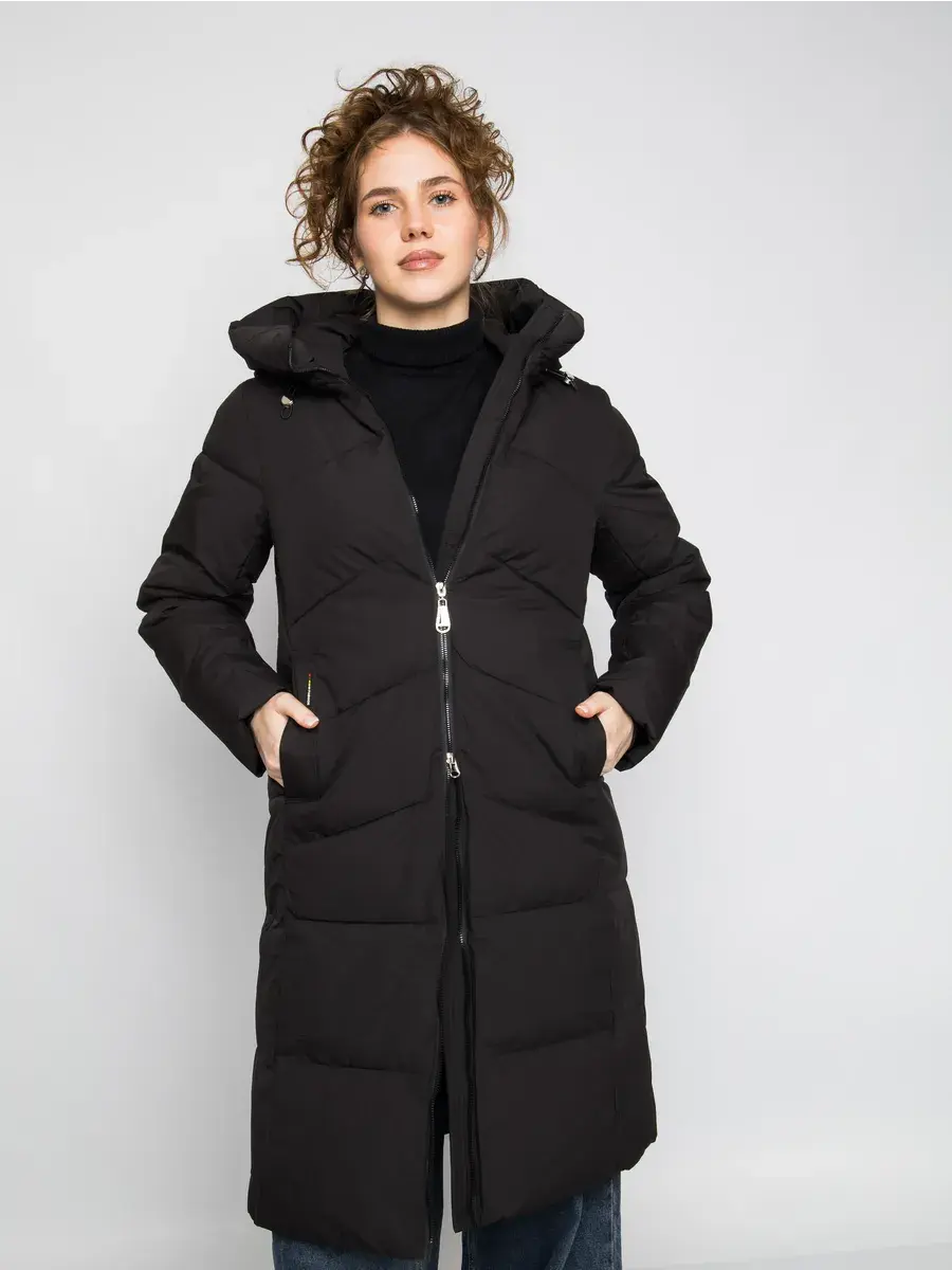 Куртка зимняя женская - это идеальный выбор для холодного сезона. Эта удлиненная модель с капюшоном обеспечит вам тепло и комфорт даже в самые морозные дни. Куртка выполнена из полиэстера с гладкой фактурой и утеплена холлофайбером, что гарантирует превосходную защиту от холода. Модель имеет прямой покрой, большой капюшон и ветрозащитный, водоотталкивающий материал, что делает ее идеальной для активного отдыха и повседневной носки. Застежка на молнию и кнопки обеспечивает надежную фиксацию, а прорезные карманы удобны для хранения необходимых мелочей. Куртка идеально дополнит ваш гардероб. Модель представлена в различных размерах, в том числе и для высоких женщин.