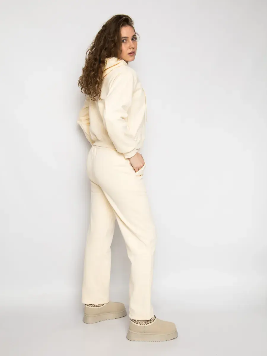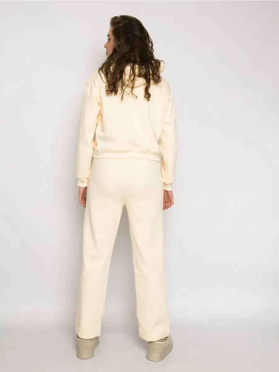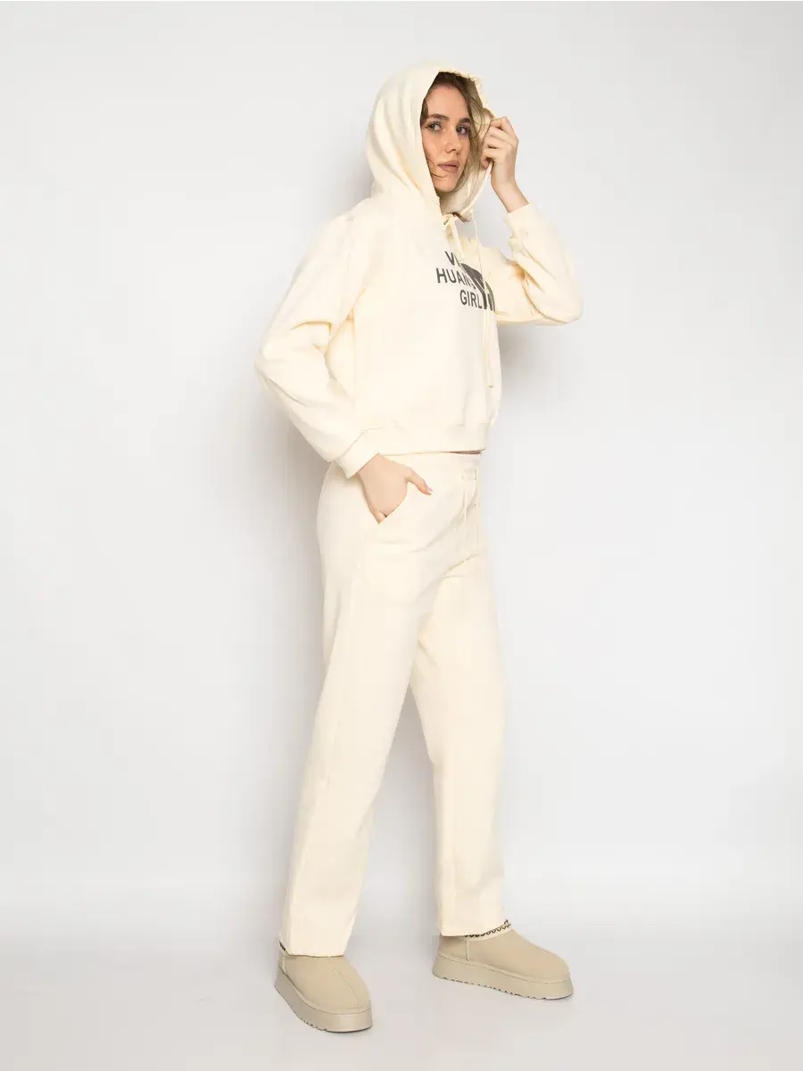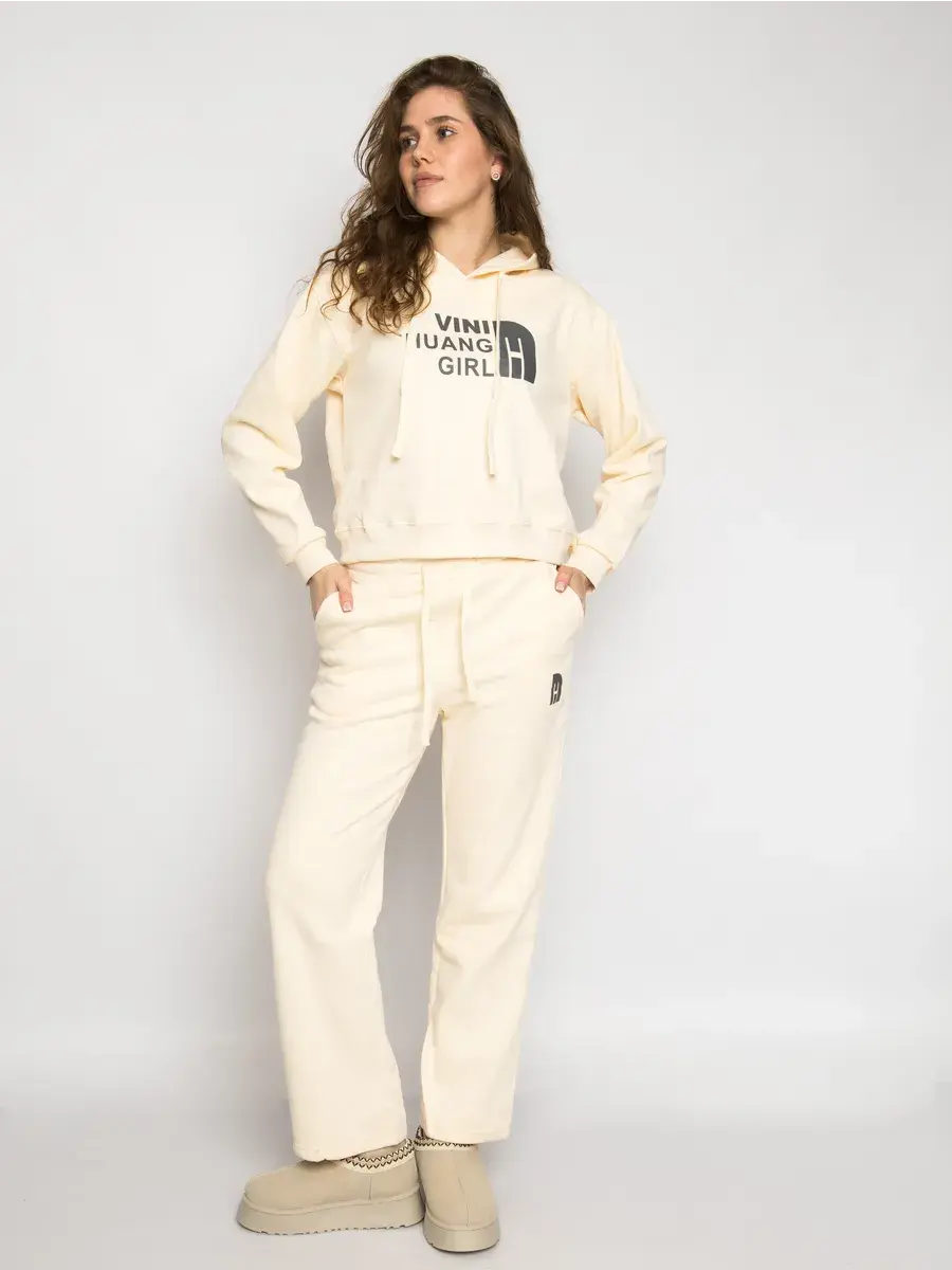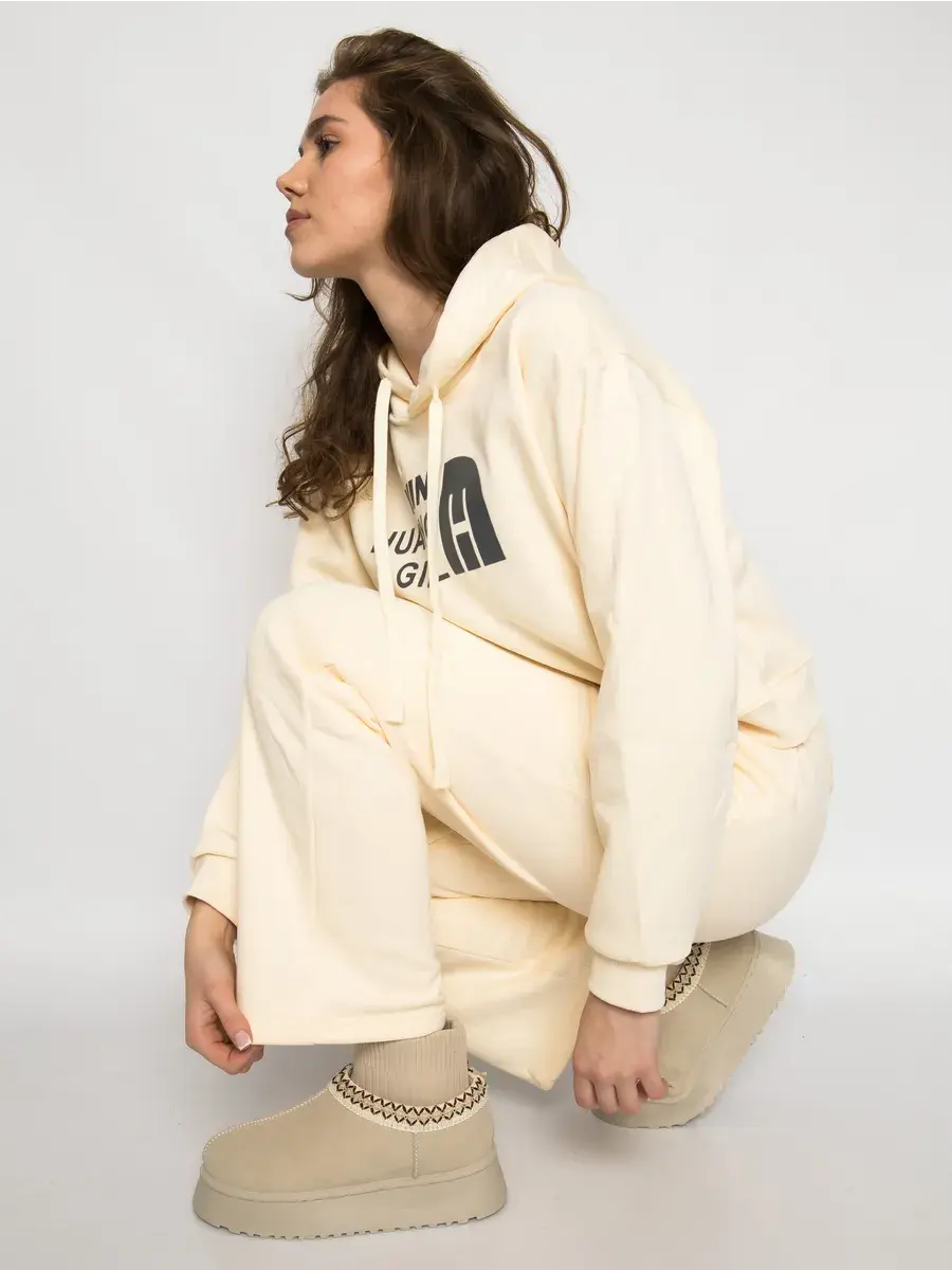 Костюм утеплённый спортивный женский из плотного трикотажа футер с мягким начёсом. В комплект входит укороченное худи с капюшоном и брюки прямые. Ткань тёплая, приятная к телу и дышащая, не просвечивает и хорошо держит форму после стирок. Свободная посадка даёт комфорт и свободу движения. Эластичный пояс со шнурком легко регулирует посадку, боковые карманы-кенгуру удобно держат мелочи. Манжеты на рукавах аккуратно фиксируют силуэт исключая проникновения холода. Универсальный цвет и лаконичный принт выглядят современно и сочетаются с различными стилями. Надпись добавляет акцент, при этом образ остаётся спокойным и базовым.