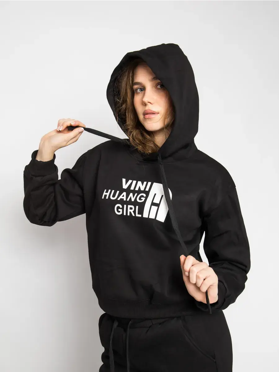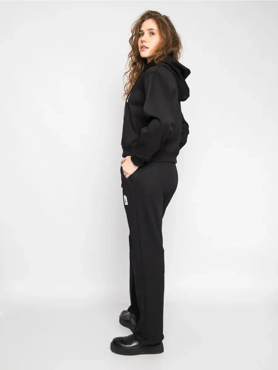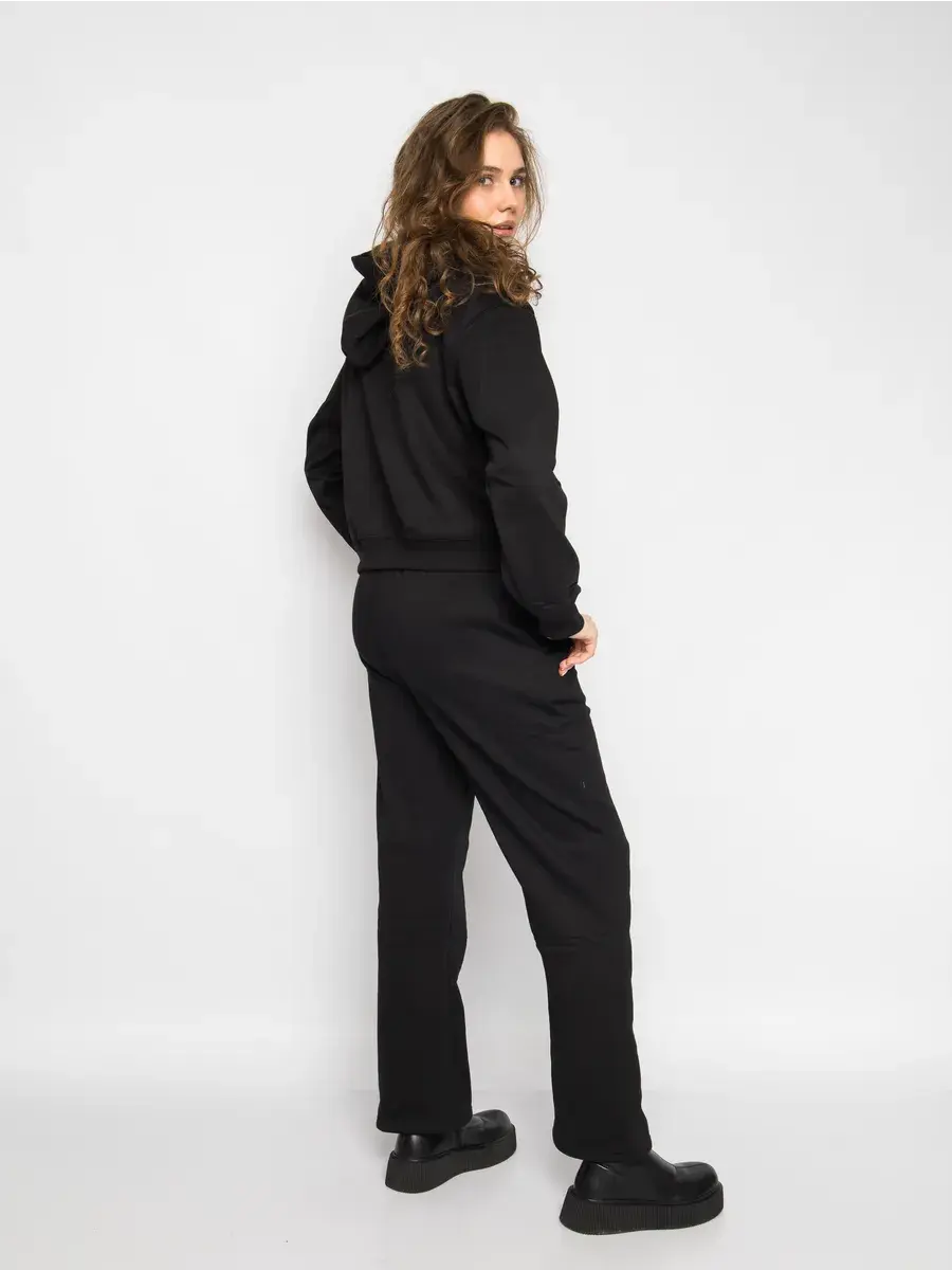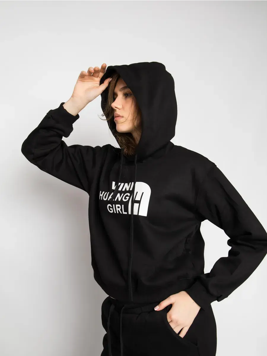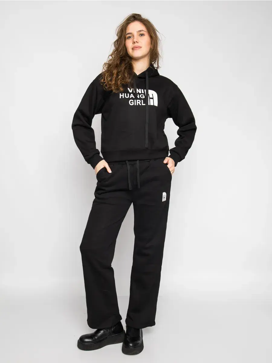 Костюм утеплённый спортивный женский из плотного трикотажа футер с мягким начёсом. В комплект входит укороченное худи с капюшоном и брюки прямые. Ткань тёплая, приятная к телу и дышащая, не просвечивает и хорошо держит форму после стирок. Свободная посадка даёт комфорт и свободу движения. Эластичный пояс со шнурком легко регулирует посадку, боковые карманы-кенгуру удобно держат мелочи. Манжеты на рукавах аккуратно фиксируют силуэт исключая проникновения холода. Универсальный цвет и лаконичный принт выглядят современно и сочетаются с различными стилями. Надпись добавляет акцент, при этом образ остаётся спокойным и базовым.