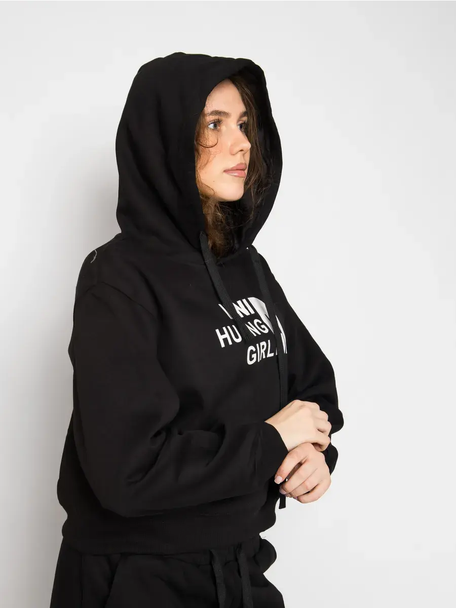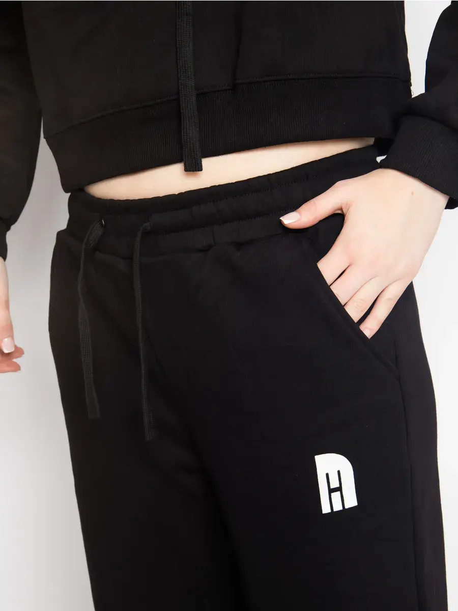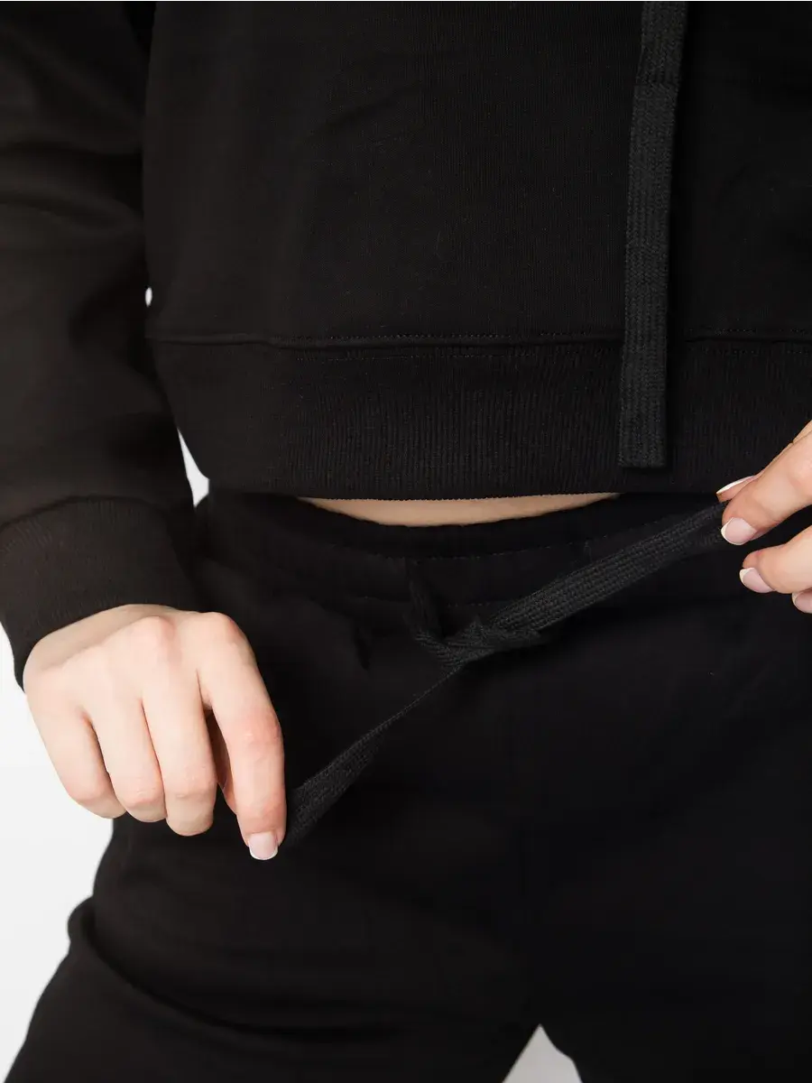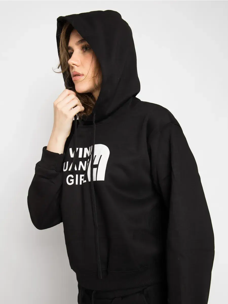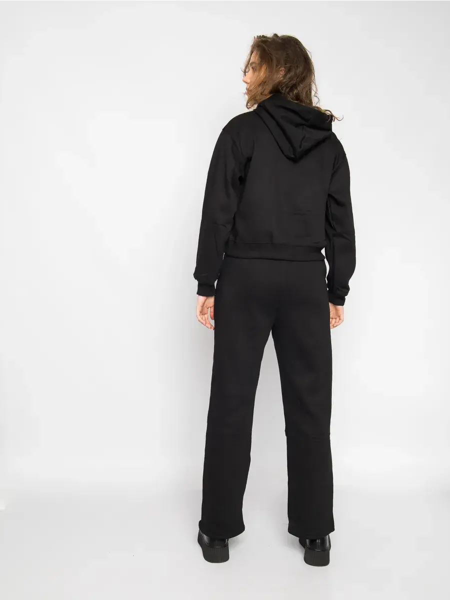 Костюм утеплённый спортивный женский из плотного трикотажа футер с мягким начёсом. В комплект входит укороченное худи с капюшоном и брюки прямые. Ткань тёплая, приятная к телу и дышащая, не просвечивает и хорошо держит форму после стирок. Свободная посадка даёт комфорт и свободу движения. Эластичный пояс со шнурком легко регулирует посадку, боковые карманы-кенгуру удобно держат мелочи. Манжеты на рукавах аккуратно фиксируют силуэт исключая проникновения холода. Универсальный цвет и лаконичный принт выглядят современно и сочетаются с различными стилями. Надпись добавляет акцент, при этом образ остаётся спокойным и базовым.