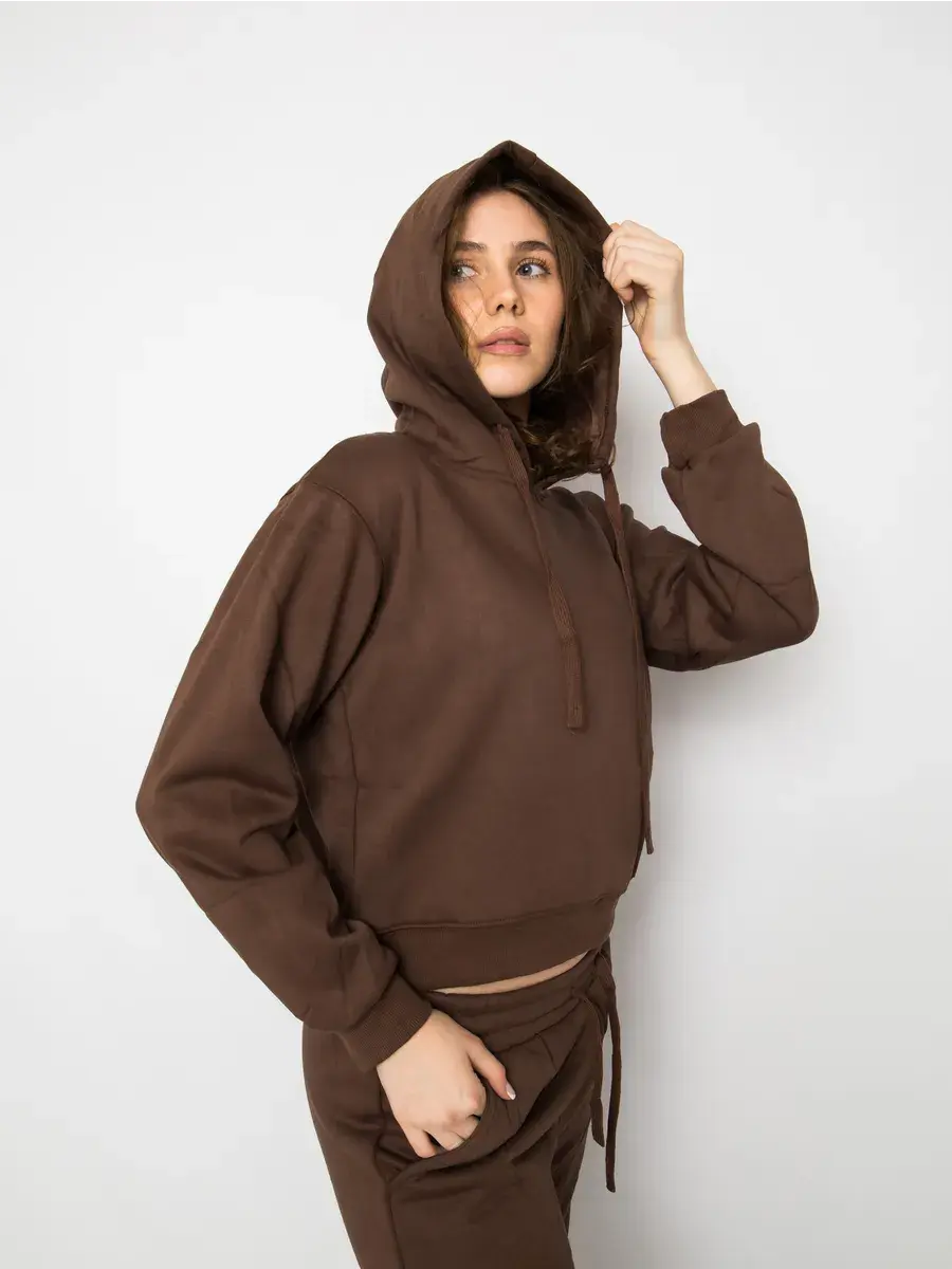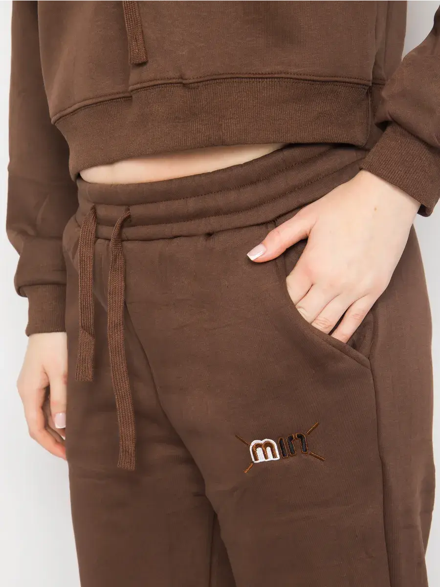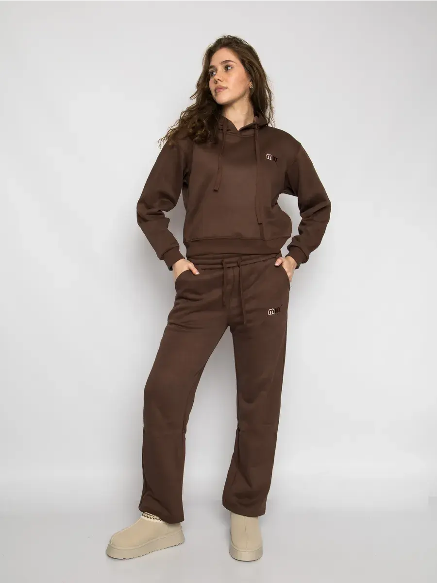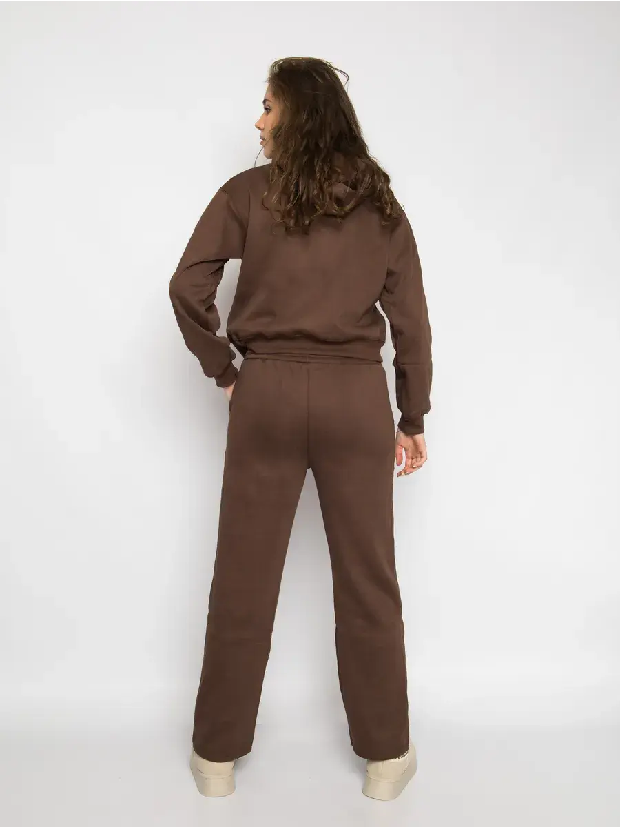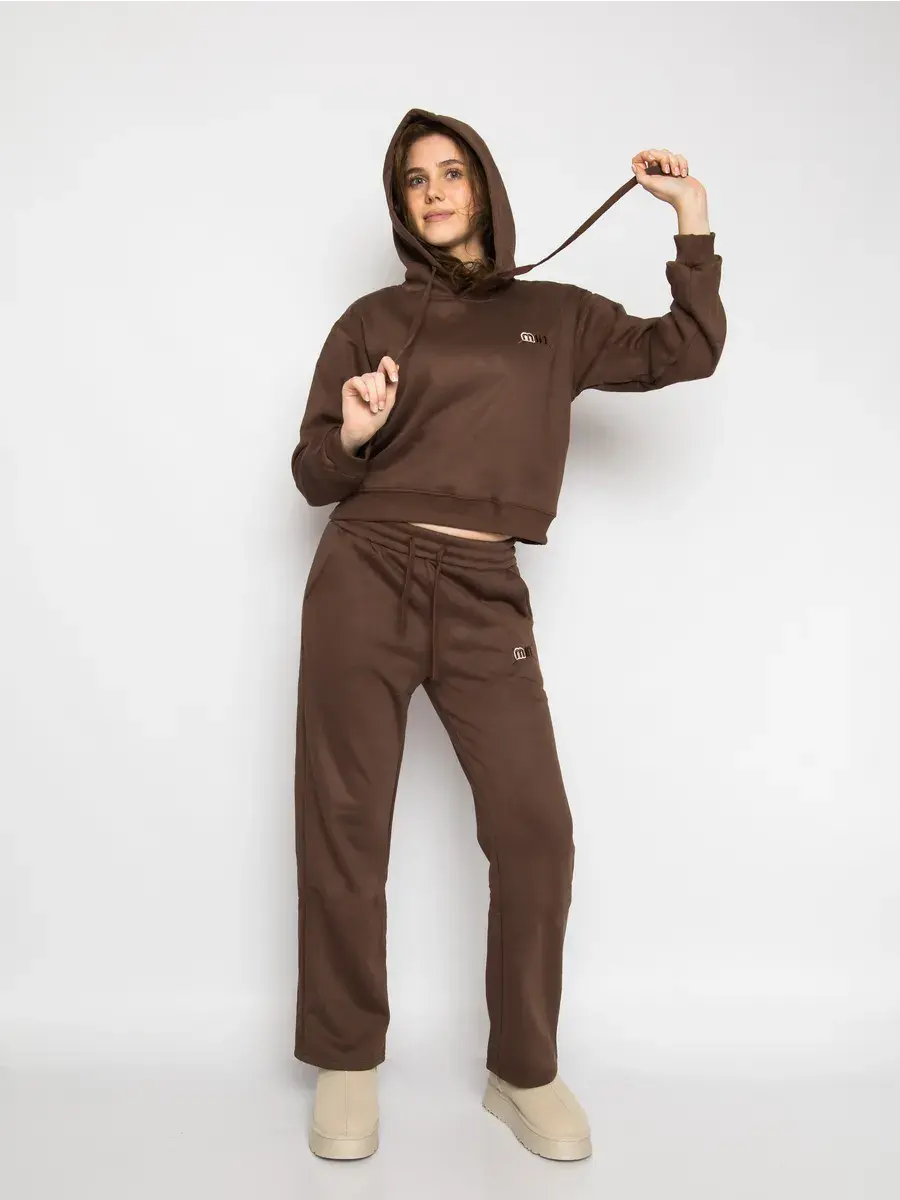 Костюм утеплённый спортивный женский из плотного трикотажа футер с мягким начёсом. В комплект входит укороченное худи с капюшоном и брюки прямые. Ткань тёплая, приятная к телу и дышащая, не просвечивает и хорошо держит форму после стирок. Свободная посадка даёт комфорт и свободу движения. Эластичный пояс со шнурком легко регулирует посадку, боковые карманы удобно держат мелочи. Манжеты на рукавах аккуратно фиксируют силуэт исключая проникновения холода. Универсальный цвет и лаконичный принт выглядят современно и сочетаются с различными стилями. Логотип добавляет акцент, при этом образ остаётся спокойным и базовым.