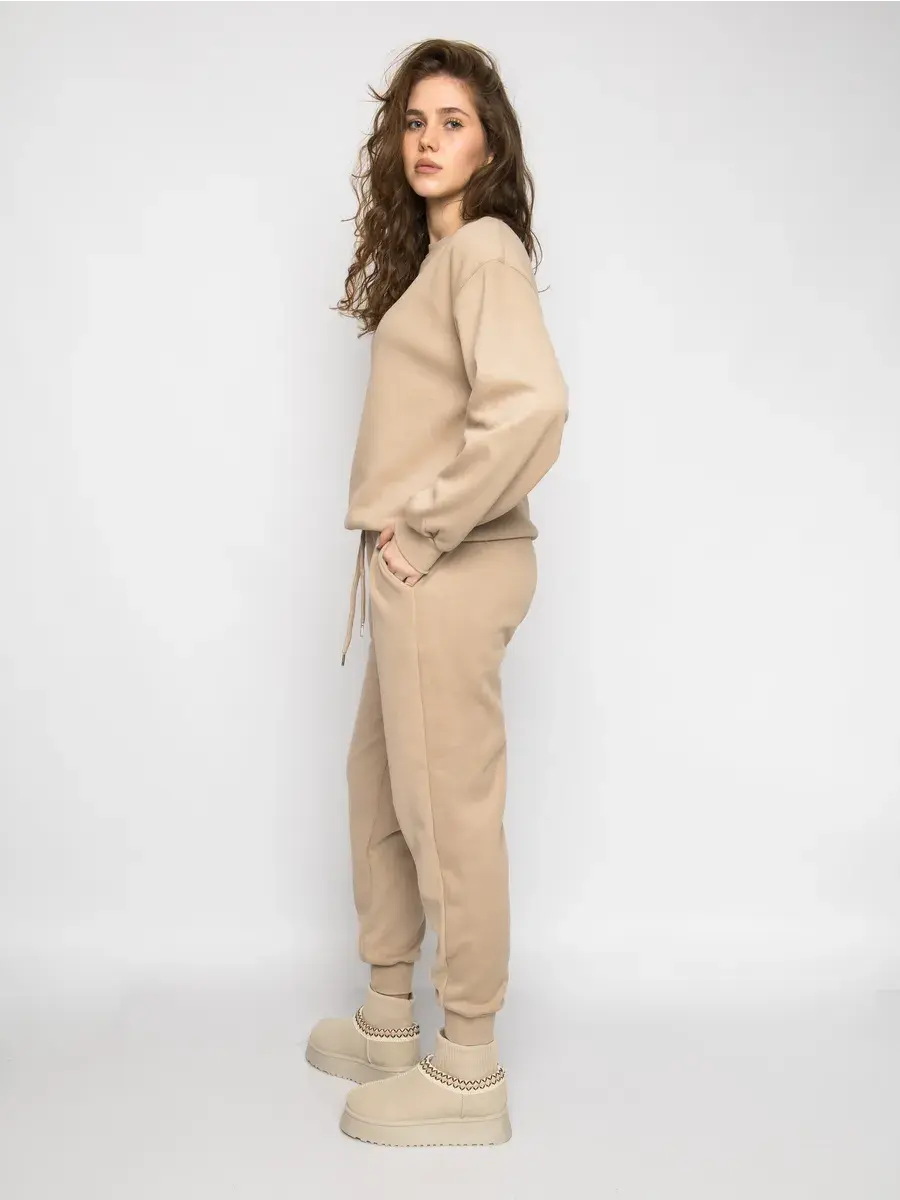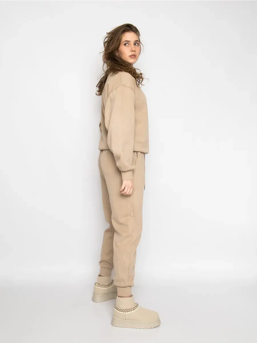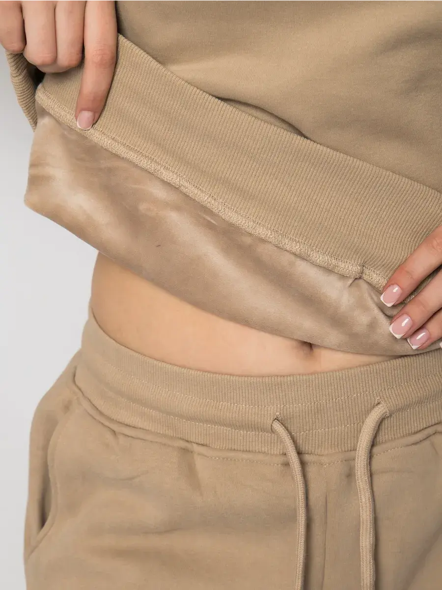 Костюм утеплённый спортивный для женщин из плотного трикотажа футер с мягким начёсом. В комплект входит худи с капюшоном и брюки с манжетами-резинками. Ткань тёплая, приятная к телу и дышащая, не просвечивает и хорошо держит форму после стирок. Свободная посадка даёт комфорт и свободу движения. Эластичный пояс со шнурком легко регулирует посадку, боковые карманы удобно держат мелочи. Манжеты на рукавах аккуратно фиксируют силуэт исключая проникновения холода. Универсальный цвет и лаконичный принт выглядят современно и сочетаются с различными стилями. Надпись добавляет акцент, при этом образ остаётся спокойным и базовым.
