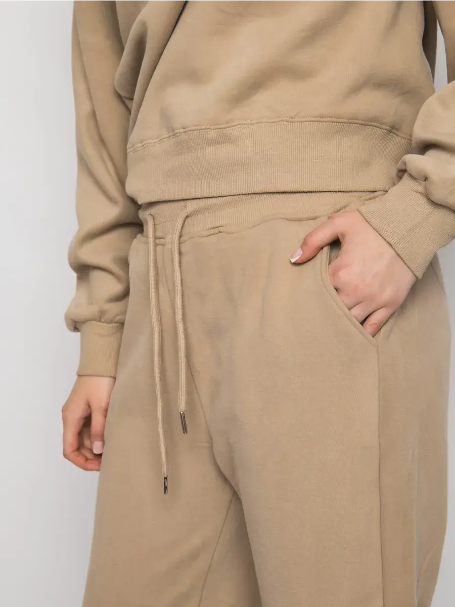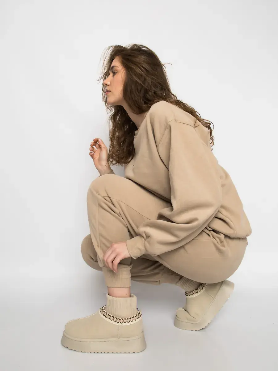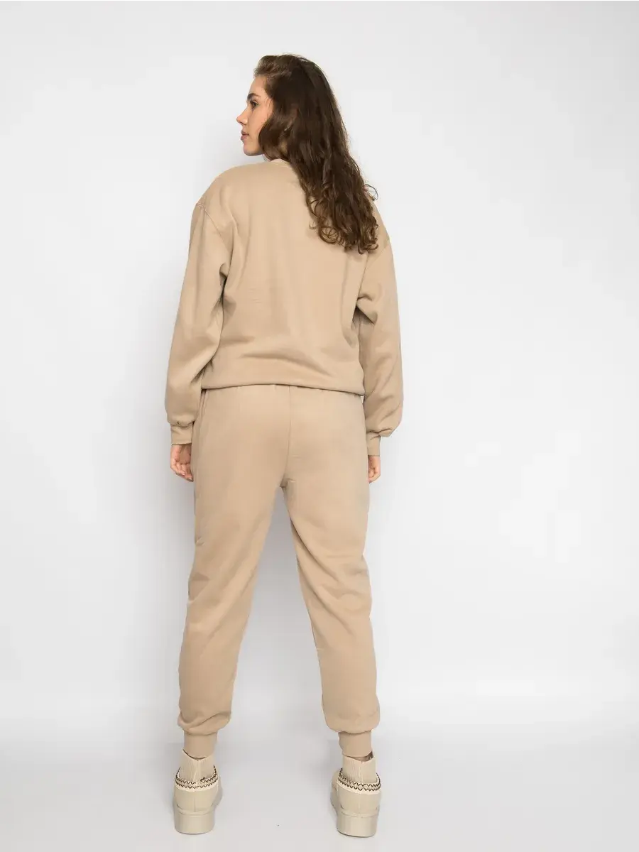Костюм утеплённый спортивный для женщин из плотного трикотажа футер с мягким начёсом. В комплект входит худи с капюшоном и брюки с манжетами-резинками. Ткань тёплая, приятная к телу и дышащая, не просвечивает и хорошо держит форму после стирок. Свободная посадка даёт комфорт и свободу движения. Эластичный пояс со шнурком легко регулирует посадку, боковые карманы удобно держат мелочи. Манжеты на рукавах аккуратно фиксируют силуэт исключая проникновения холода. Универсальный цвет и лаконичный принт выглядят современно и сочетаются с различными стилями. Надпись добавляет акцент, при этом образ остаётся спокойным и базовым.