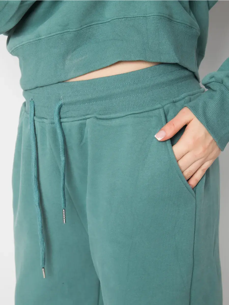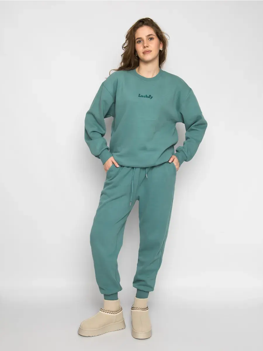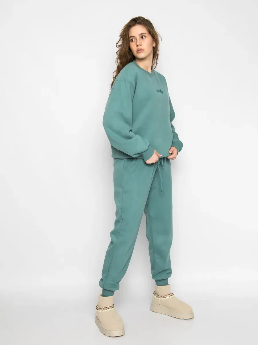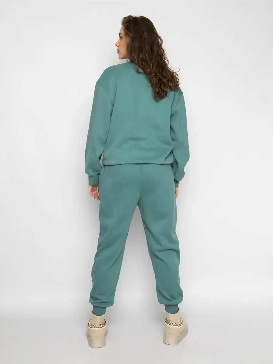 Костюм утеплённый спортивный для женщин из плотного трикотажа футер с мягким начёсом. В комплект входит худи с капюшоном и брюки с манжетами-резинками. Ткань тёплая, приятная к телу и дышащая, не просвечивает и хорошо держит форму после стирок. Свободная посадка даёт комфорт и свободу движения. Эластичный пояс со шнурком легко регулирует посадку, боковые карманы удобно держат мелочи. Манжеты на рукавах аккуратно фиксируют силуэт исключая проникновения холода. Универсальный цвет и лаконичный принт выглядят современно и сочетаются с различными стилями. Надпись добавляет акцент, при этом образ остаётся спокойным и базовым.
