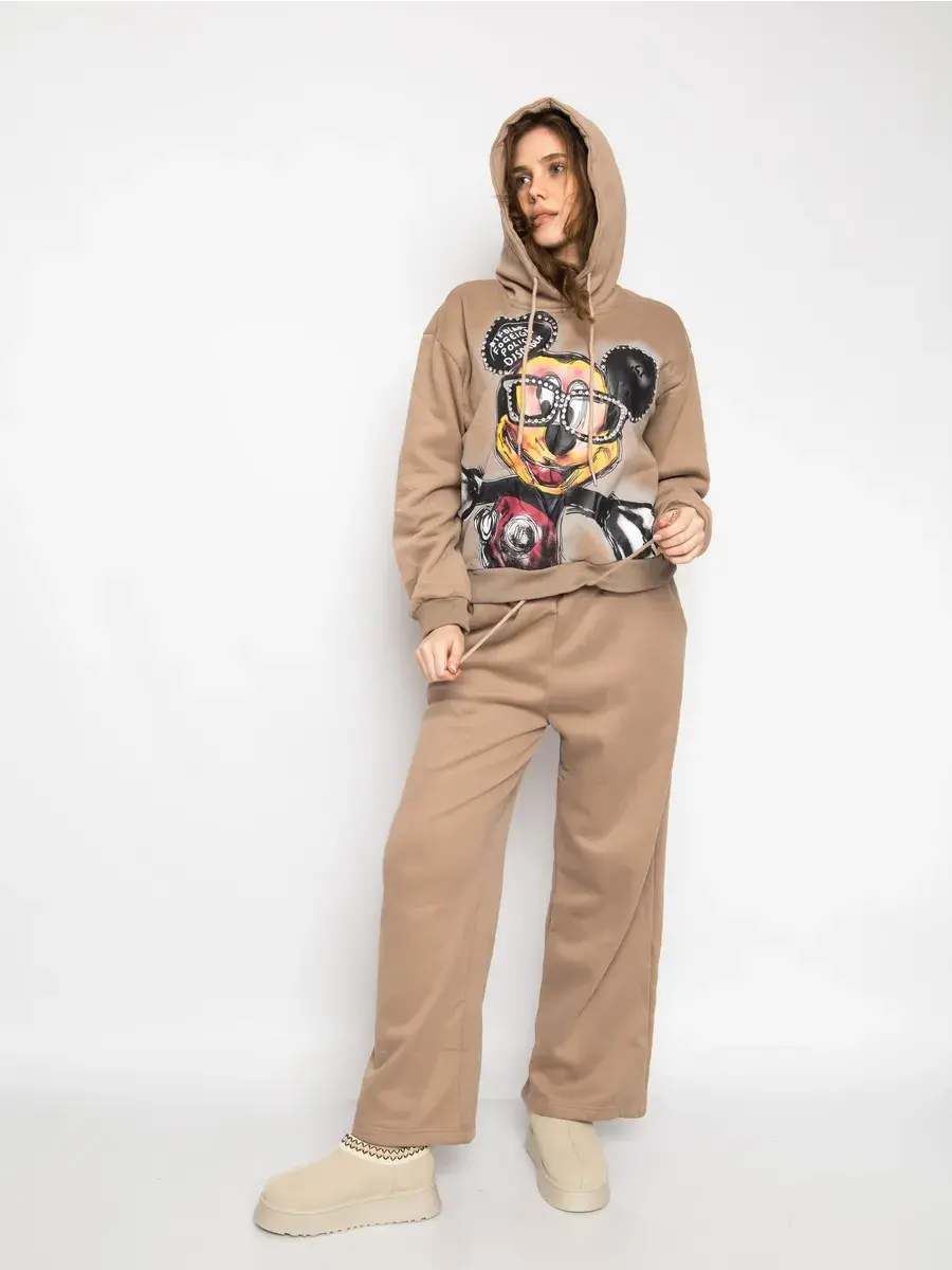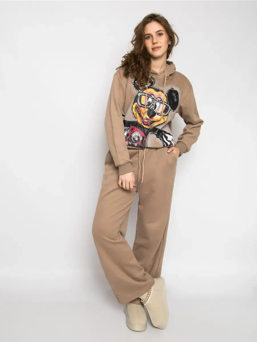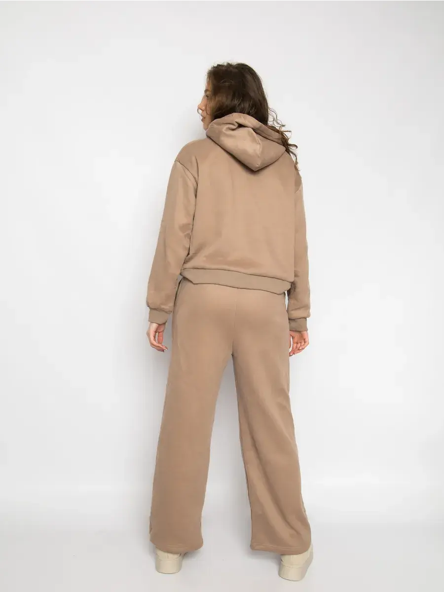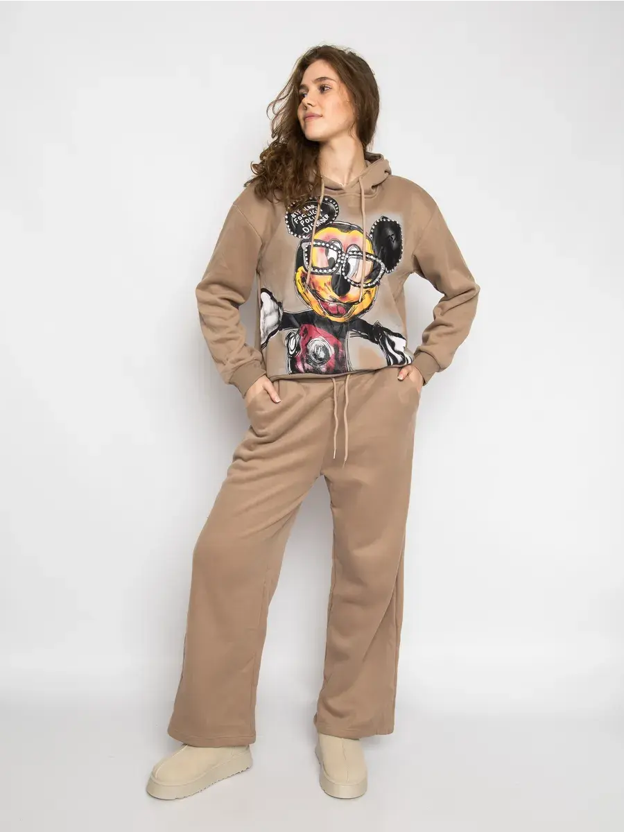 Костюм утеплённый спортивный женский из плотного трикотажа футер с мягким начёсом. В комплект входит укороченное худи с капюшоном и брюки прямые. Ткань тёплая, приятная к телу и дышащая, не просвечивает и хорошо держит форму после стирок. Свободная посадка даёт комфорт и свободу движения. Эластичный пояс со шнурком легко регулирует посадку, боковые карманы удобно держат мелочи. Манжеты на рукавах аккуратно фиксируют силуэт исключая проникновения холода. Универсальный цвет и лаконичный принт выглядят современно и сочетаются с различными стилями. Рисунок добавляет акцент, при этом образ остаётся спокойным и базовым.