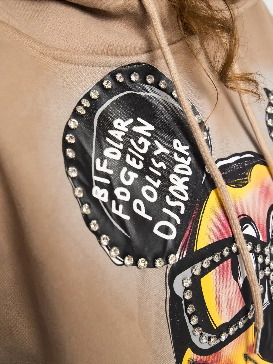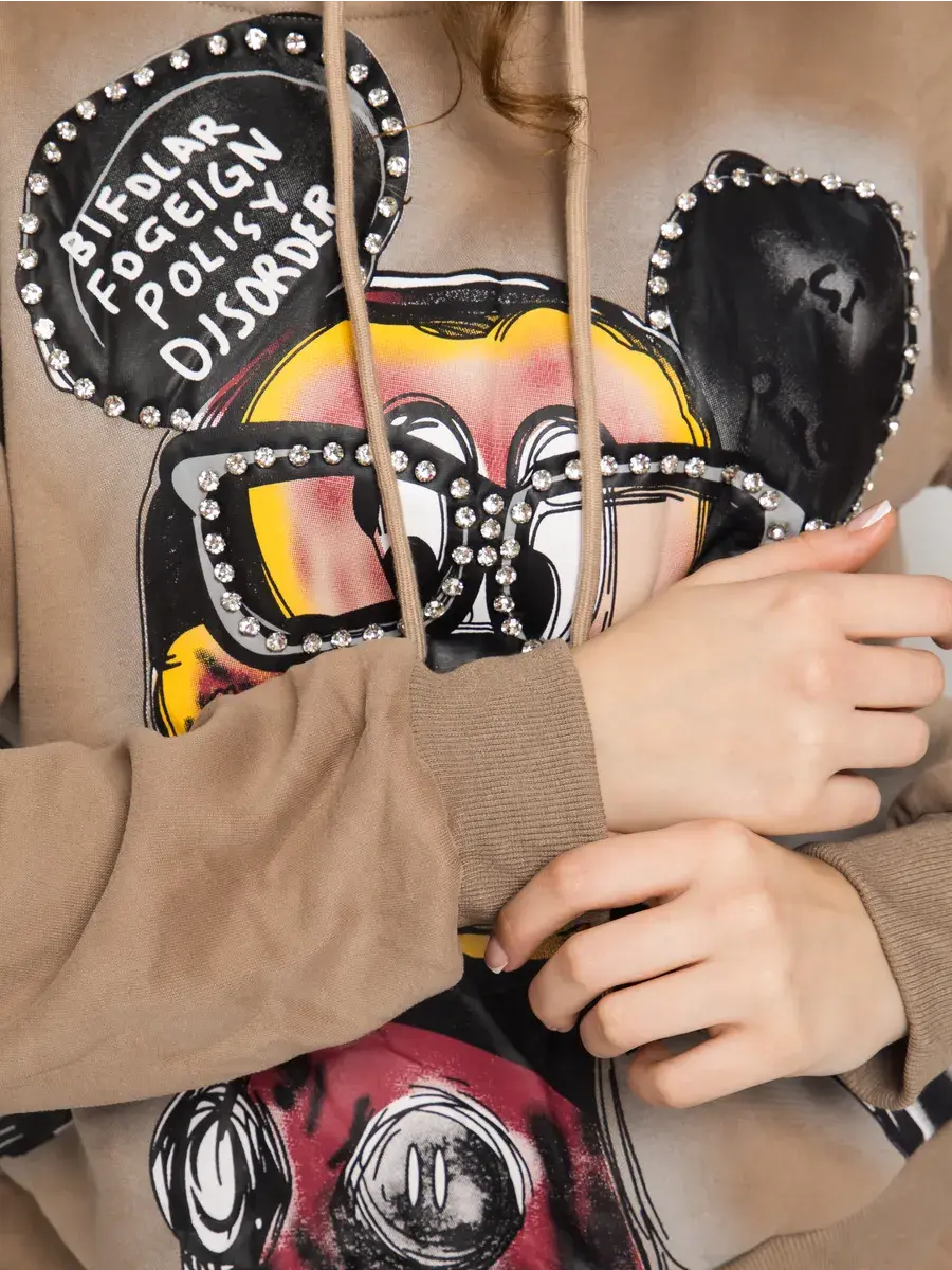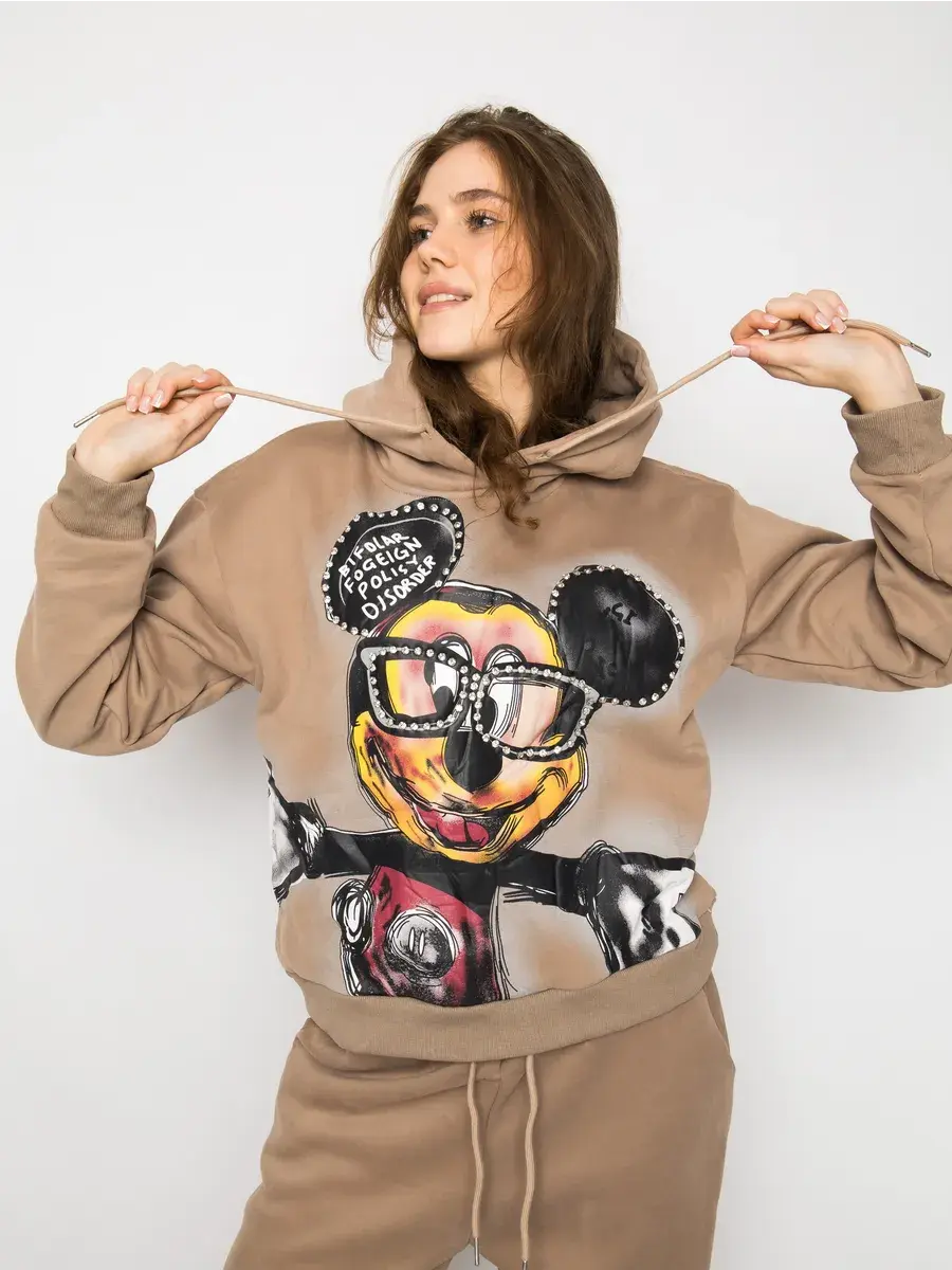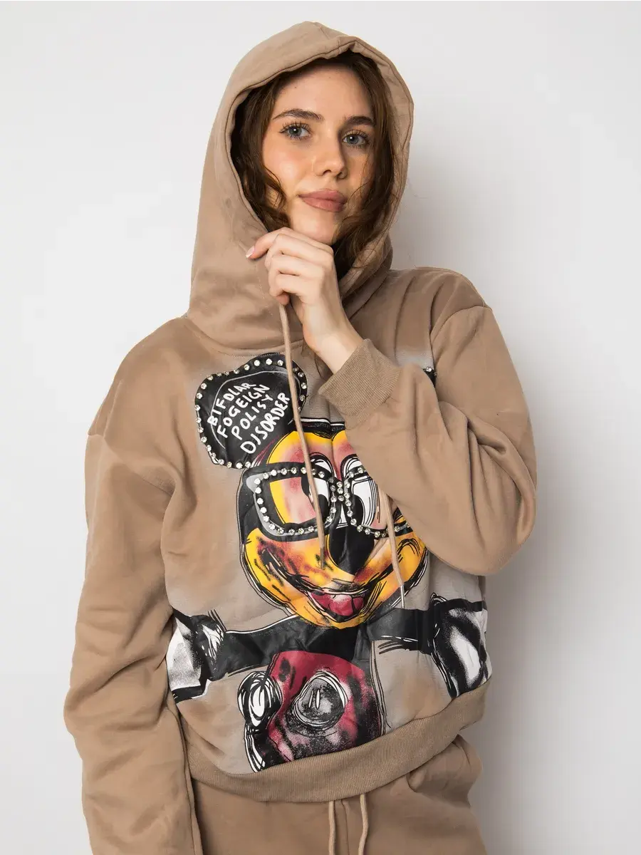 Костюм утеплённый спортивный женский из плотного трикотажа футер с мягким начёсом. В комплект входит укороченное худи с капюшоном и брюки прямые. Ткань тёплая, приятная к телу и дышащая, не просвечивает и хорошо держит форму после стирок. Свободная посадка даёт комфорт и свободу движения. Эластичный пояс со шнурком легко регулирует посадку, боковые карманы удобно держат мелочи. Манжеты на рукавах аккуратно фиксируют силуэт исключая проникновения холода. Универсальный цвет и лаконичный принт выглядят современно и сочетаются с различными стилями. Рисунок добавляет акцент, при этом образ остаётся спокойным и базовым.