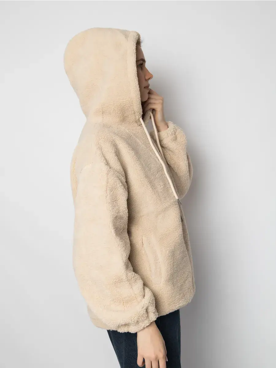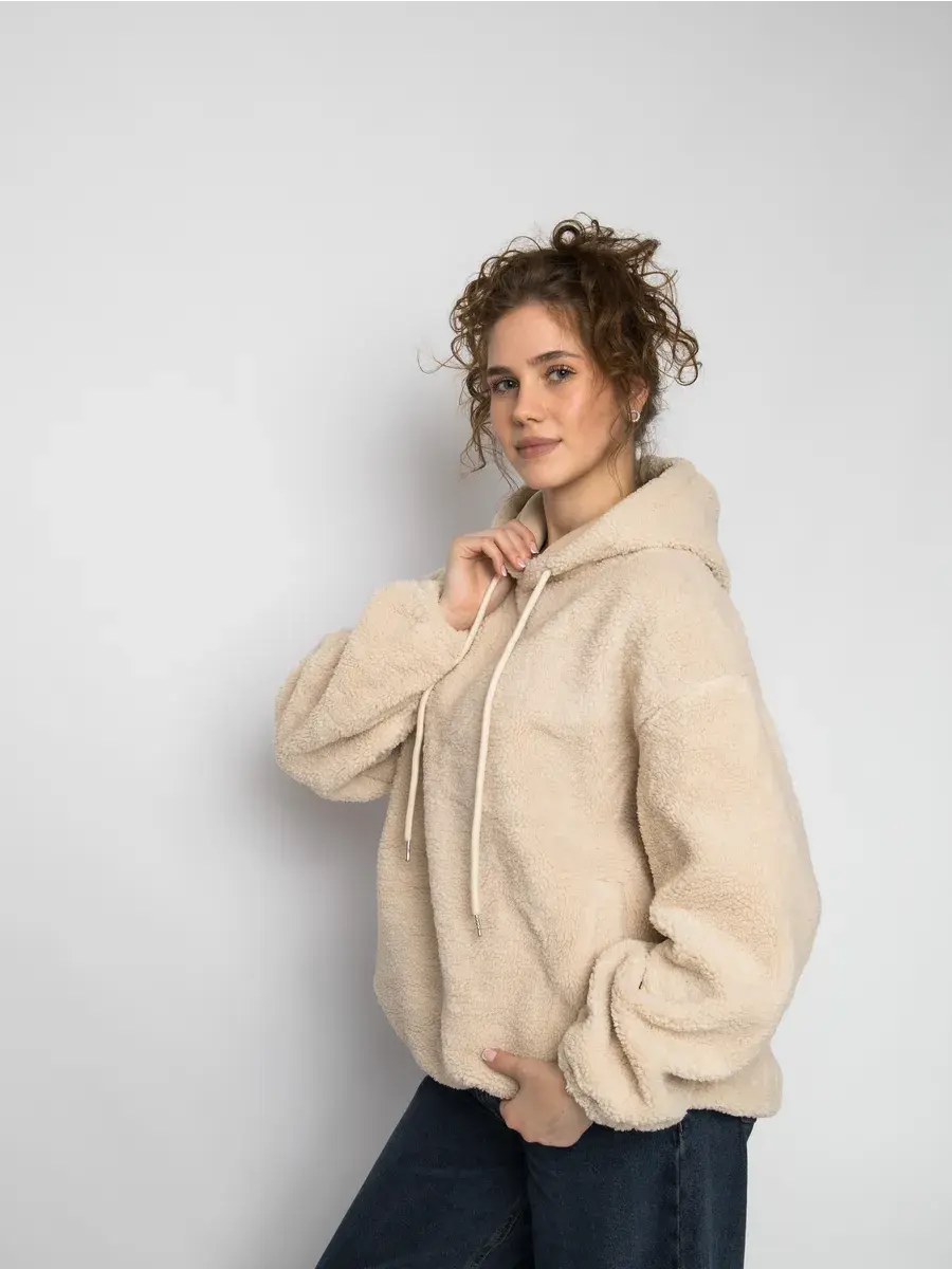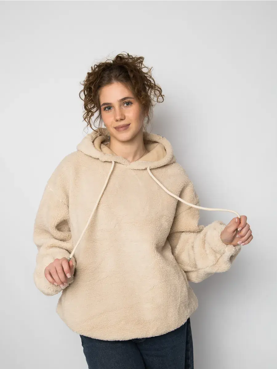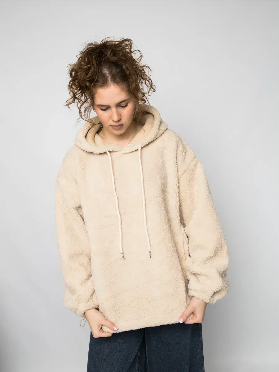 Худи женское утеплённое с капюшоном из мягкого плюшевого флиса «шерпа». Цвет подчёркивает женственность, а бархатистая фактура даёт эффект объятия и хорошо сохраняет тепло. Свободная оверсайз-посадка с комфортной линией плеч не стесняет движения. Внутри приятный начёс, капюшон на кулиске защищает от ветра, эластичные манжеты берегут тепло рук. По низу — регулировка шнуром: можно носить прямым или собрать по талии. Карман согревает ладони и вмещает мелочи. Ткань проста в уходе, быстро сохнет и надолго остаётся мягкой. Модель универсальна: хорошо сидит в привычном размере и даёт ощущение комфорта с первой примерки. Толстовка подойдёт на осень, зиму и прохладную весну — для прогулок, дороги и отдыха. Эта модель — удачный выбор: лёгкая, тёплая, нежная на ощупь, с продуманными деталями и современным силуэтом.
