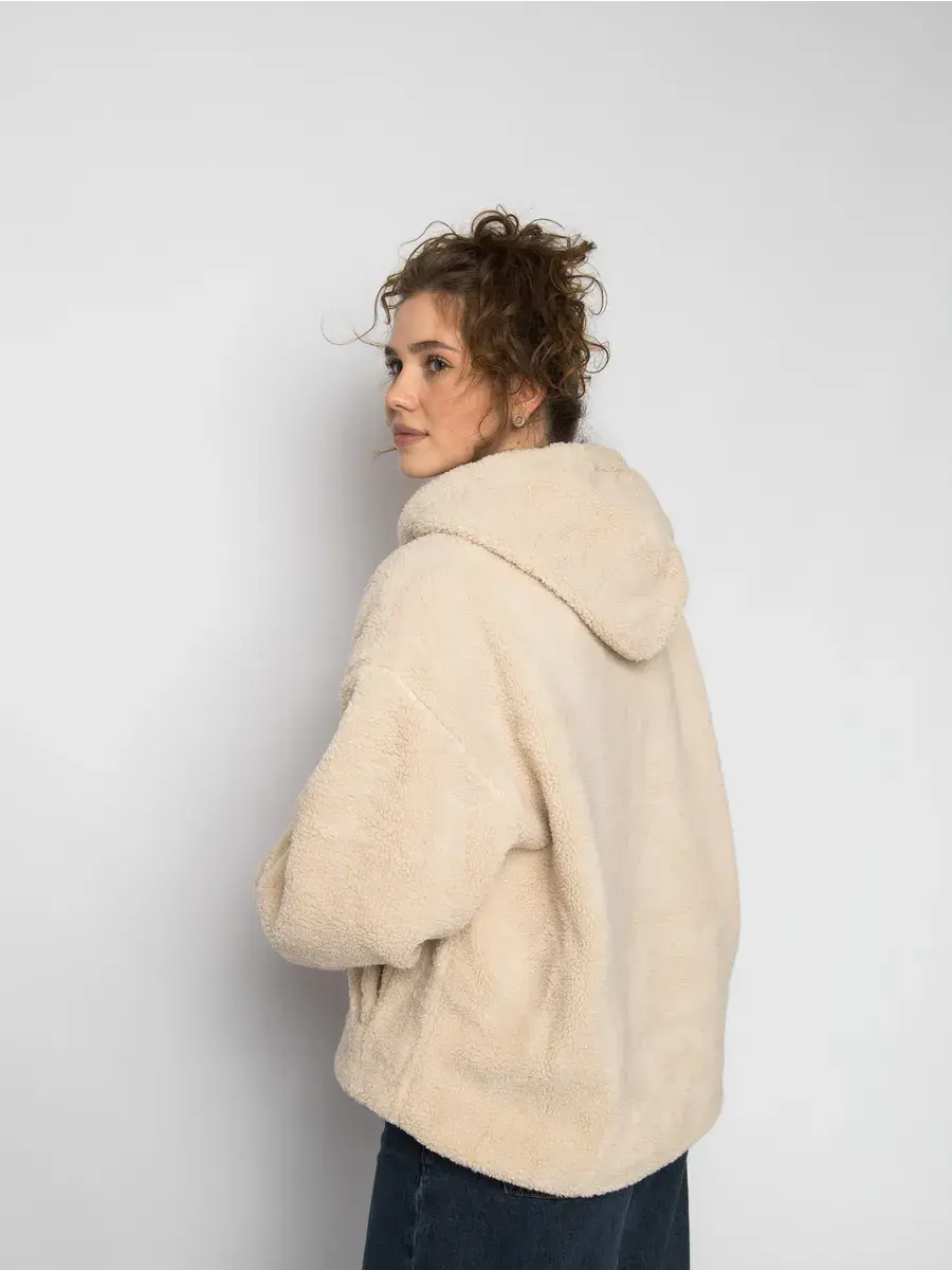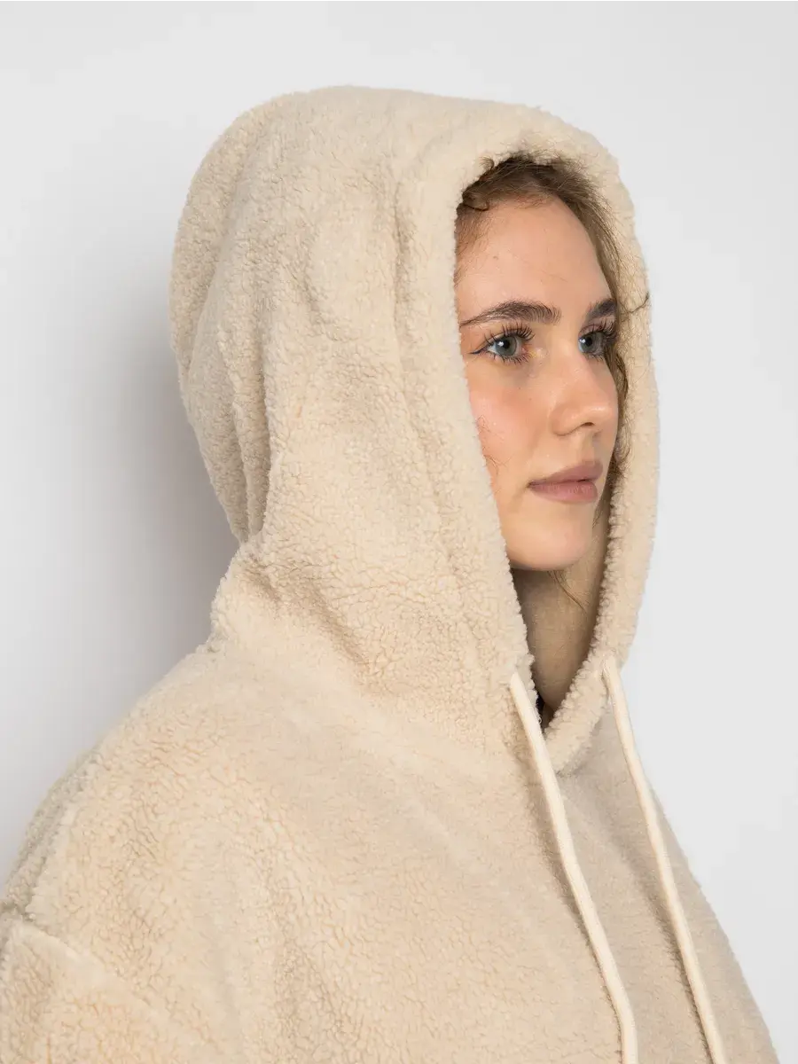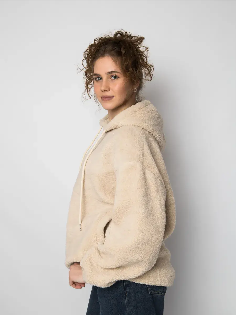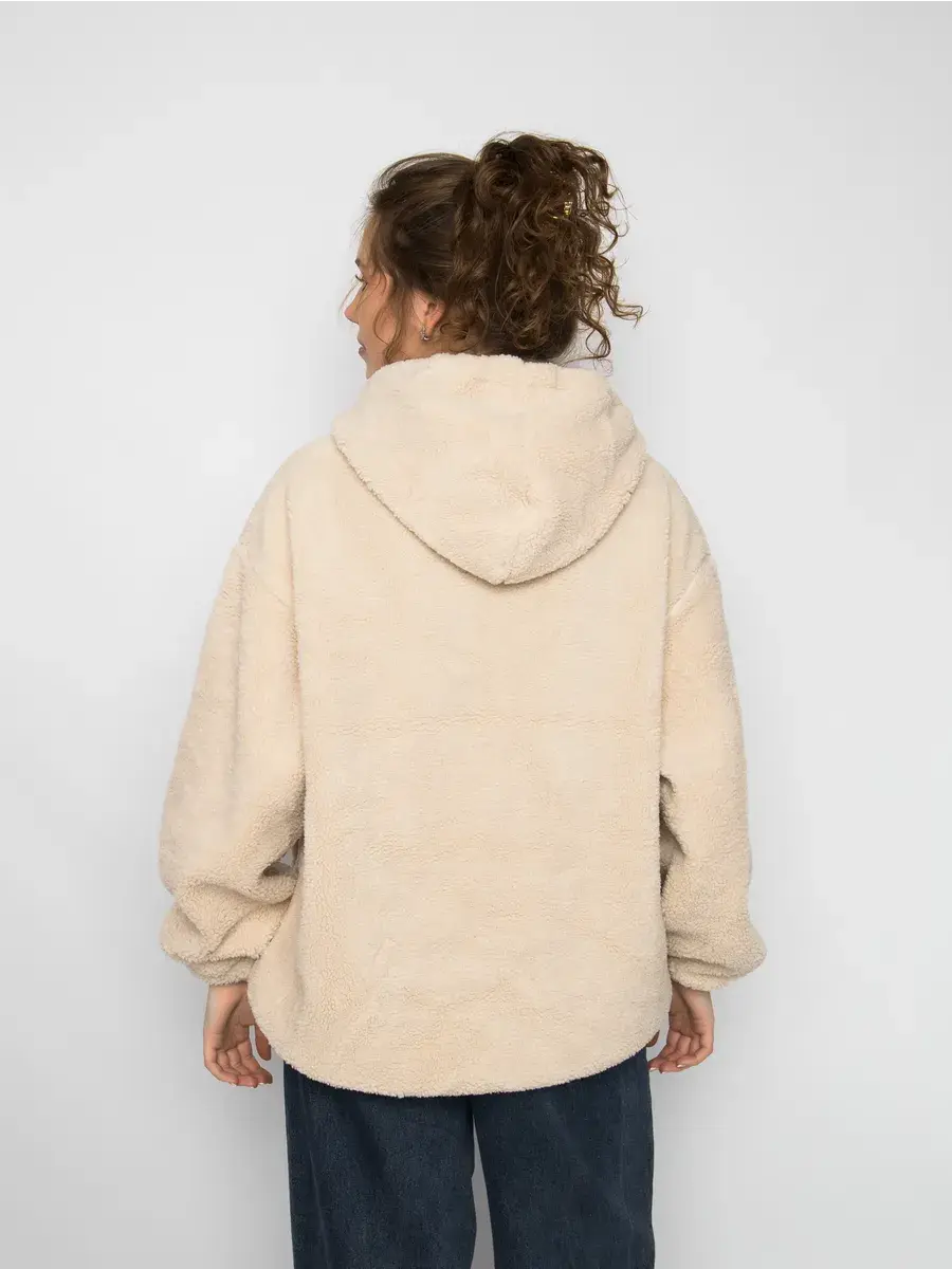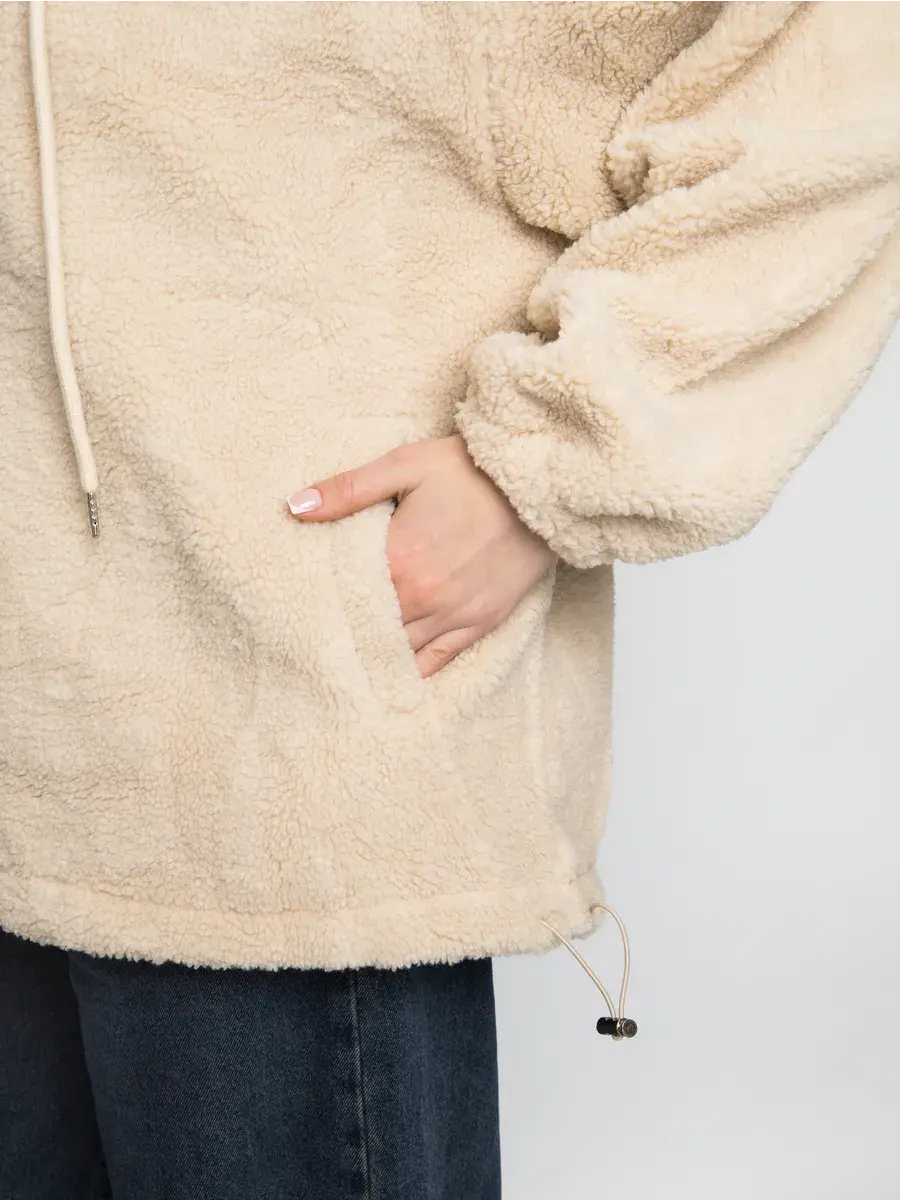 Худи женское утеплённое с капюшоном из мягкого плюшевого флиса «шерпа». Цвет подчёркивает женственность, а бархатистая фактура даёт эффект объятия и хорошо сохраняет тепло. Свободная оверсайз-посадка с комфортной линией плеч не стесняет движения. Внутри приятный начёс, капюшон на кулиске защищает от ветра, эластичные манжеты берегут тепло рук. По низу — регулировка шнуром: можно носить прямым или собрать по талии. Карман согревает ладони и вмещает мелочи. Ткань проста в уходе, быстро сохнет и надолго остаётся мягкой. Модель универсальна: хорошо сидит в привычном размере и даёт ощущение комфорта с первой примерки. Толстовка подойдёт на осень, зиму и прохладную весну — для прогулок, дороги и отдыха. Эта модель — удачный выбор: лёгкая, тёплая, нежная на ощупь, с продуманными деталями и современным силуэтом.