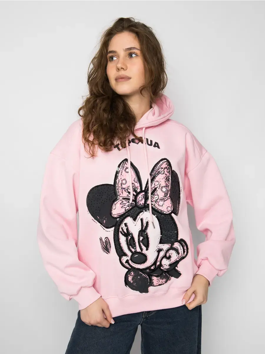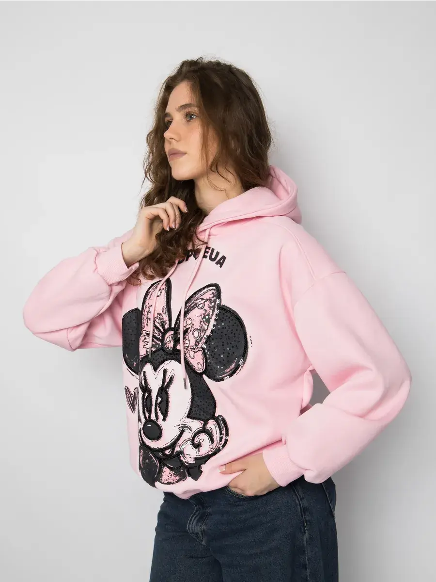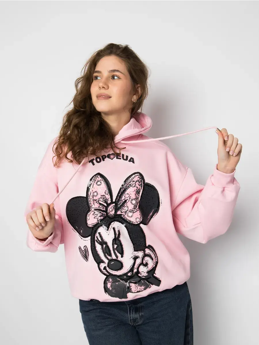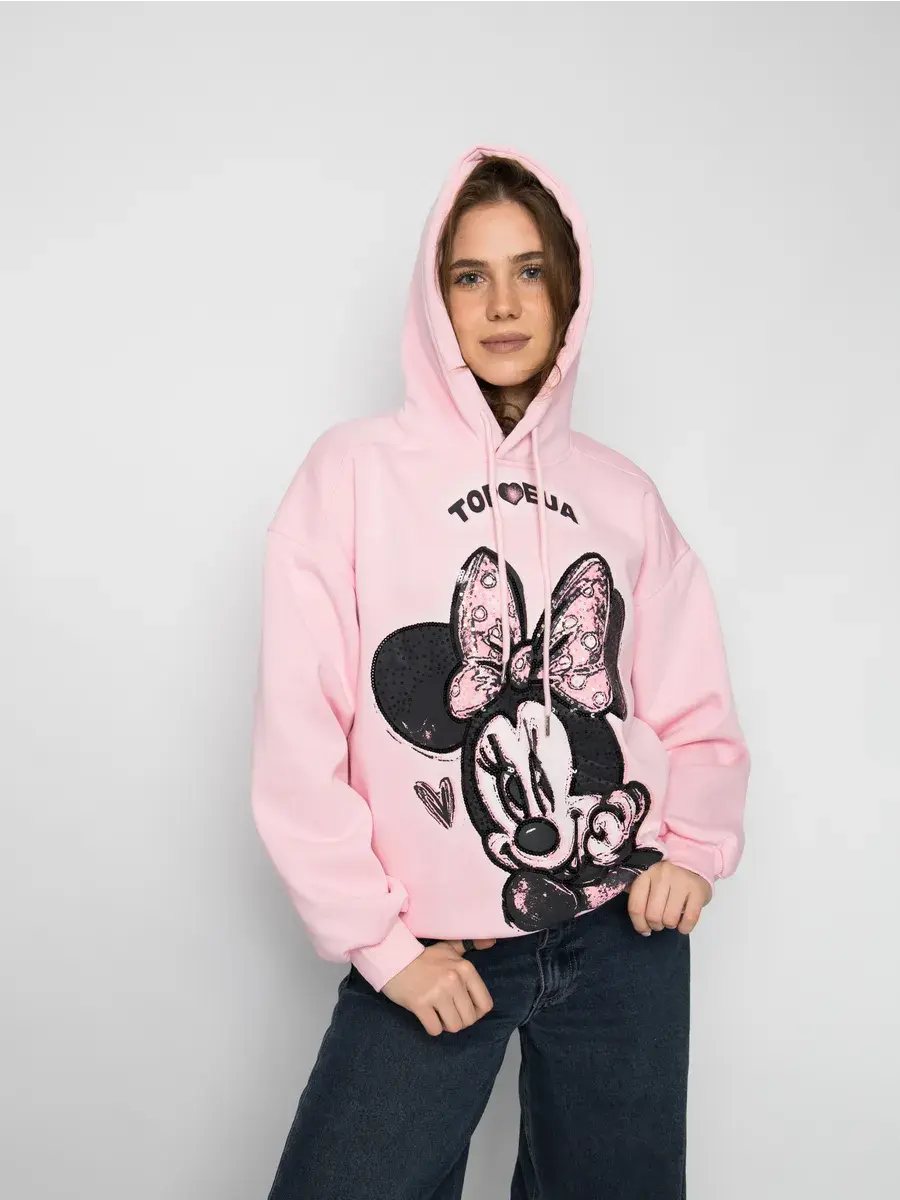 Толстовка женская утеплённая незаменимый вид одежды. Плотный трикотаж с утеплением внутри — мягкий флисовый начёс удерживает тепло и остаётся комфортным к телу. Свободная оверсайз посадка с заниженной линией плеч не сковывает движения, капюшон на кулиске защищает от ветра. Эластичные манжеты и плотная рибана по низу фиксируют посадку и помогают сохранять тепло, швы аккуратные и износостойкие. Центральный акцент — яркий принт-персонаж с долговечной отделкой: рисунок не трескается и сохраняет насыщенность после стирок. Материал неприхотлив в уходе: стирать при 30° наизнанку, быстро сохнет, не садится и не линяет. Модель хорошо сидит в привычном размере, даёт уют и чувство защищённости в прохладную погоду; подходит на осень, зиму и раннюю весну для города, учёбы и отдыха. Если ищете тёплое худи с начёсом и капюшоном в универсальном цвете, эта теплая толстовка станет практичным и стильным выбором.