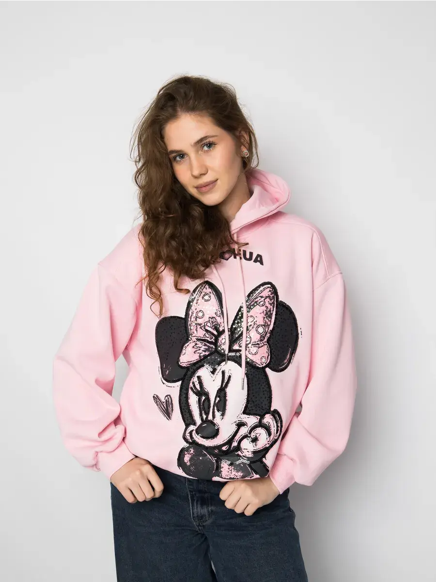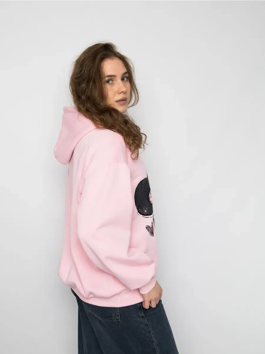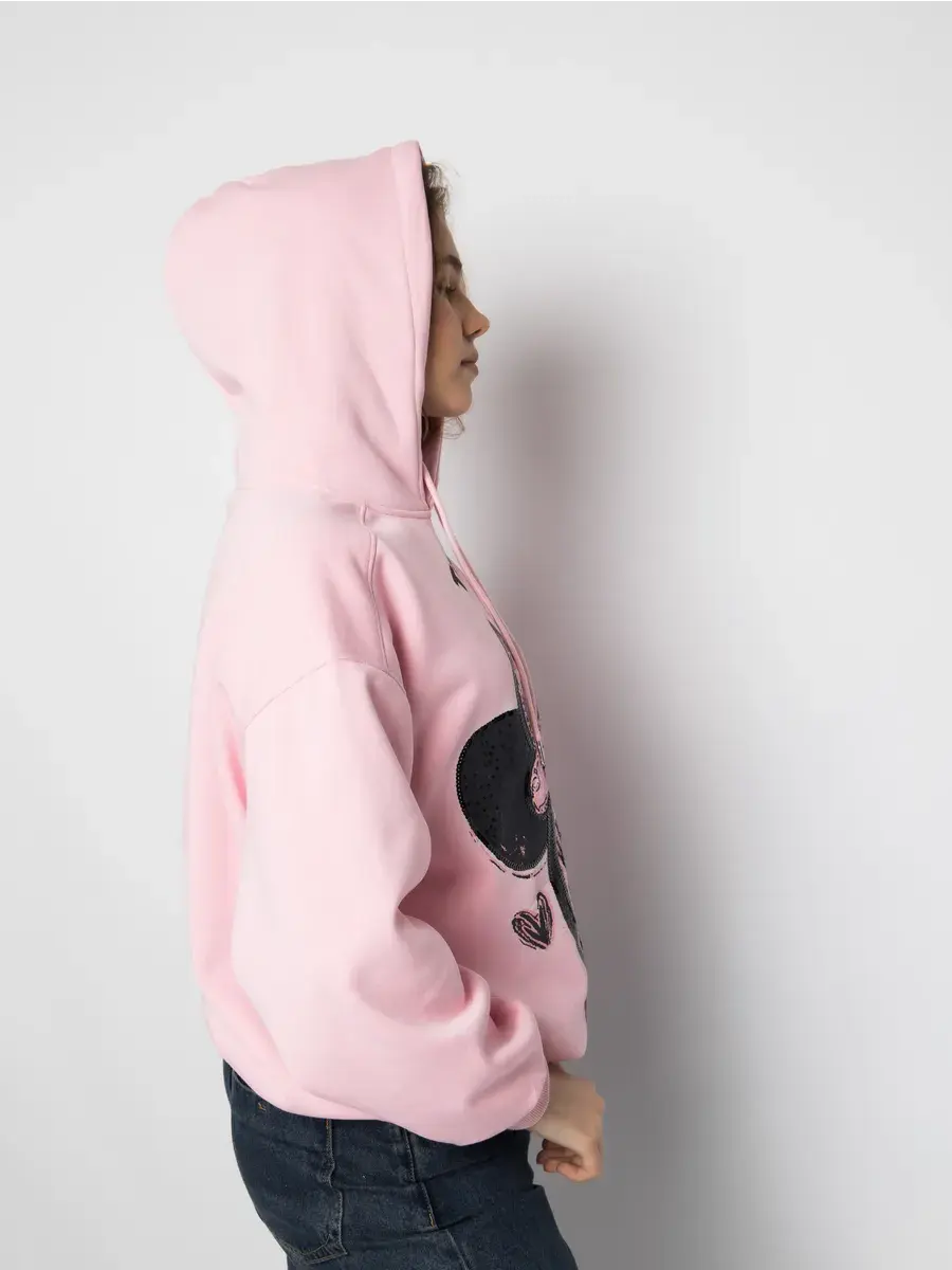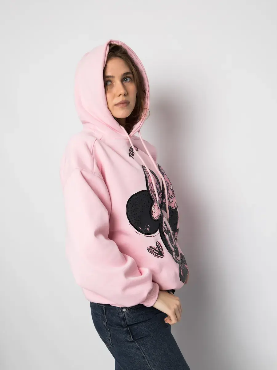 Толстовка женская утеплённая незаменимый вид одежды. Плотный трикотаж с утеплением внутри — мягкий флисовый начёс удерживает тепло и остаётся комфортным к телу. Свободная оверсайз посадка с заниженной линией плеч не сковывает движения, капюшон на кулиске защищает от ветра. Эластичные манжеты и плотная рибана по низу фиксируют посадку и помогают сохранять тепло, швы аккуратные и износостойкие. Центральный акцент — яркий принт-персонаж с долговечной отделкой: рисунок не трескается и сохраняет насыщенность после стирок. Материал неприхотлив в уходе: стирать при 30° наизнанку, быстро сохнет, не садится и не линяет. Модель хорошо сидит в привычном размере, даёт уют и чувство защищённости в прохладную погоду; подходит на осень, зиму и раннюю весну для города, учёбы и отдыха. Если ищете тёплое худи с начёсом и капюшоном в универсальном цвете, эта теплая толстовка станет практичным и стильным выбором.