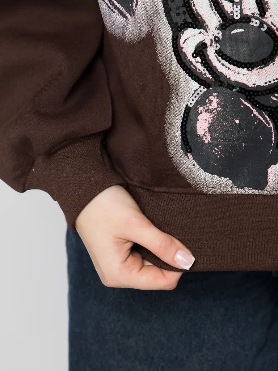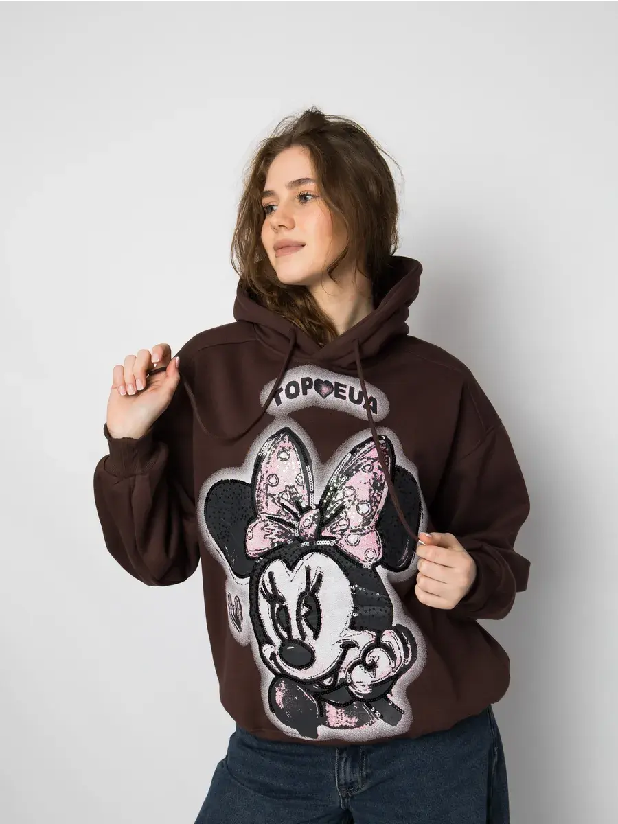 Толстовка женская утеплённая незаменимый вид одежды. Плотный трикотаж с утеплением внутри — мягкий флисовый начёс удерживает тепло и остаётся комфортным к телу. Свободная оверсайз посадка с заниженной линией плеч не сковывает движения, капюшон на кулиске защищает от ветра. Эластичные манжеты и плотная рибана по низу фиксируют посадку и помогают сохранять тепло, швы аккуратные и износостойкие. Центральный акцент — яркий принт-персонаж с долговечной отделкой: рисунок не трескается и сохраняет насыщенность после стирок. Материал неприхотлив в уходе: стирать при 30° наизнанку, быстро сохнет, не садится и не линяет. Модель хорошо сидит в привычном размере, даёт уют и чувство защищённости в прохладную погоду; подходит на осень, зиму и раннюю весну для города, учёбы и отдыха. Если ищете тёплое худи с начёсом и капюшоном в универсальном цвете, эта теплая толстовка станет практичным и стильным выбором.