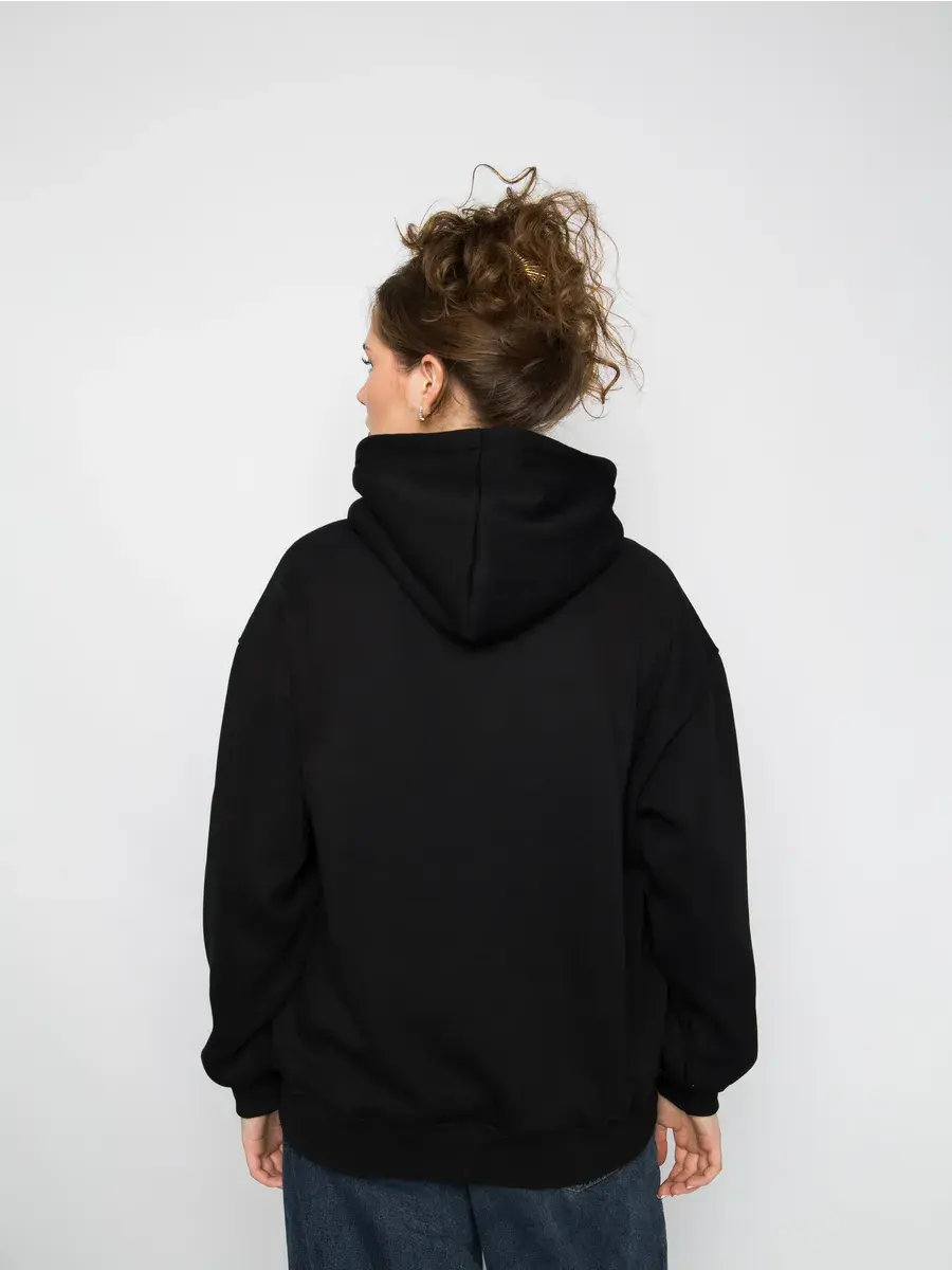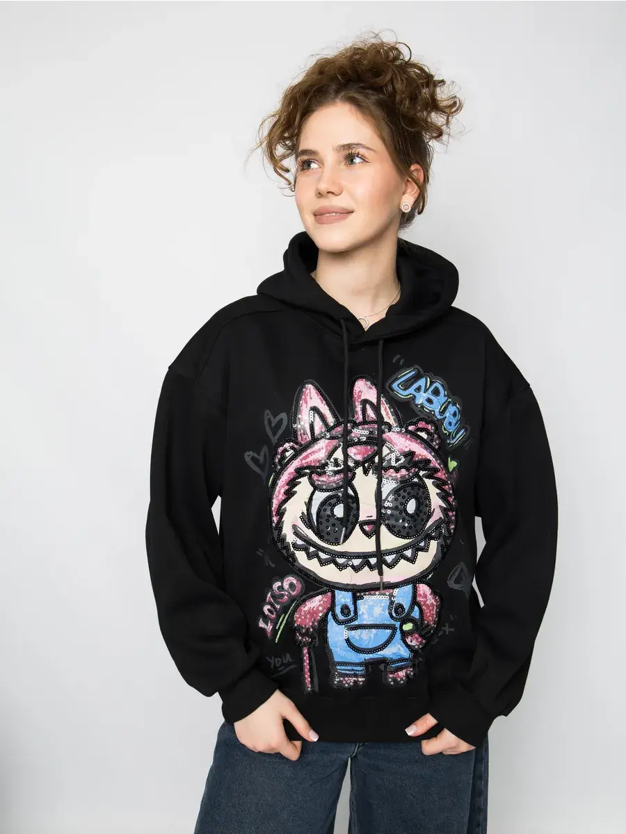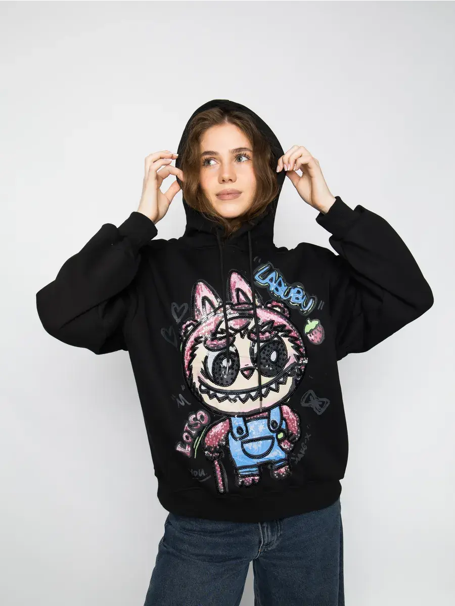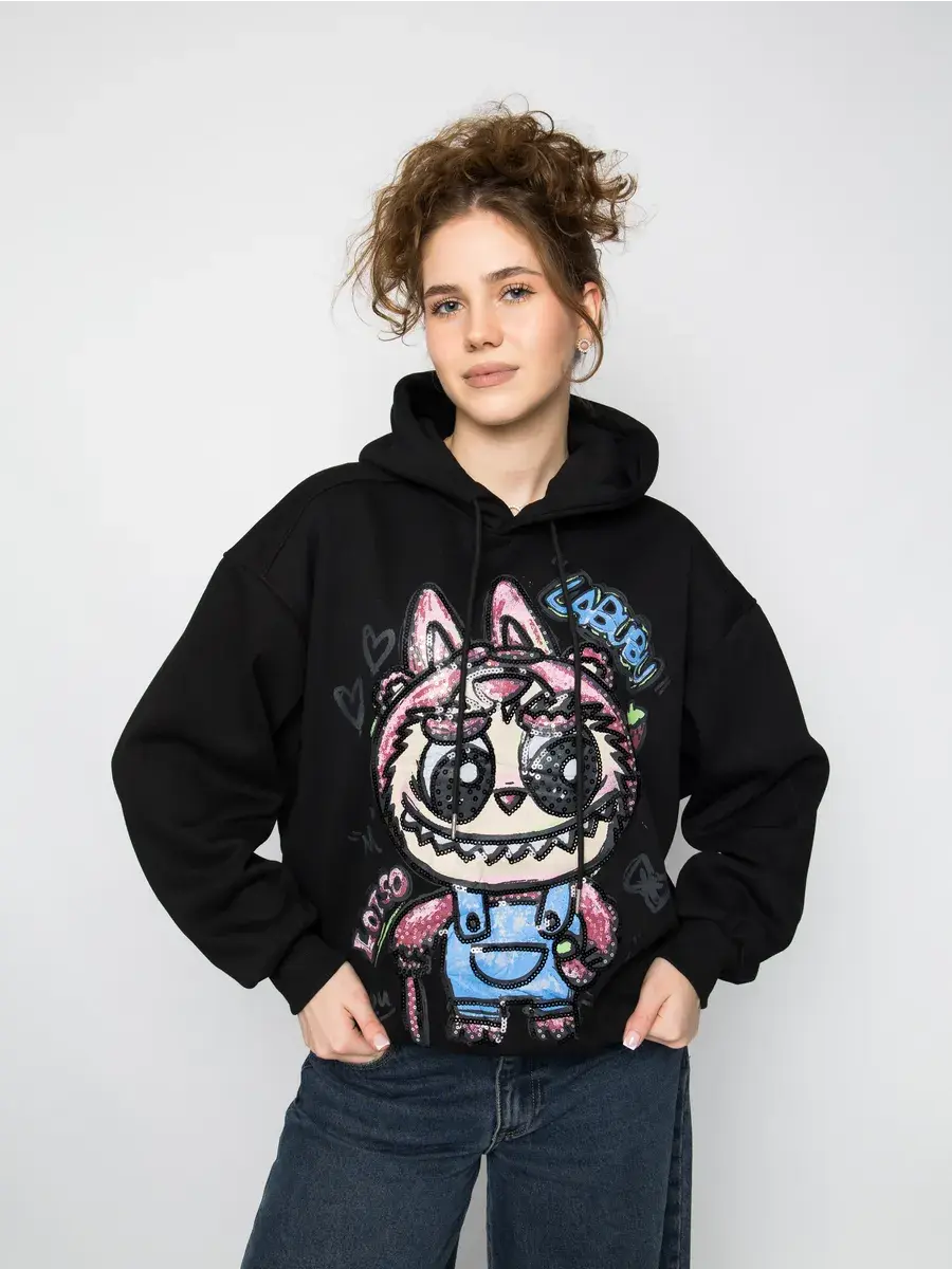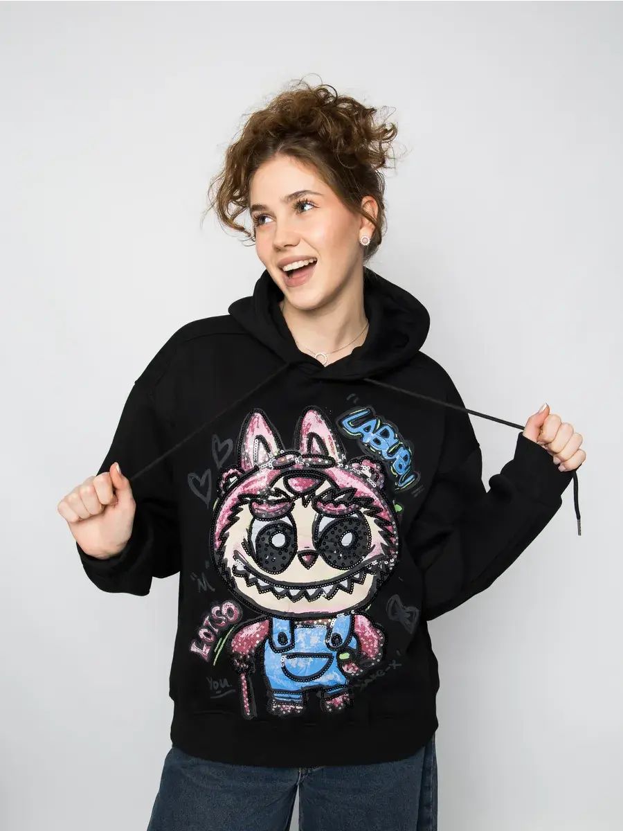 Толстовка женская утеплённая незаменимый вид одежды. Плотный трикотаж с утеплением внутри — мягкий флисовый начёс удерживает тепло и остаётся комфортным к телу. Свободная оверсайз посадка с заниженной линией плеч не сковывает движения, капюшон на кулиске защищает от ветра. Эластичные манжеты и плотная рибана по низу фиксируют посадку и помогают сохранять тепло, швы аккуратные и износостойкие. Центральный акцент — яркий принт-персонаж с долговечной отделкой: рисунок не трескается и сохраняет насыщенность после стирок. Материал неприхотлив в уходе: стирать при 30° наизнанку, быстро сохнет, не садится и не линяет. Модель хорошо сидит в привычном размере, даёт уют и чувство защищённости в прохладную погоду; подходит на осень, зиму и раннюю весну для города, учёбы и отдыха. Если ищете тёплое худи с начёсом и капюшоном в универсальном цвете, эта теплая толстовка станет практичным и стильным выбором.
