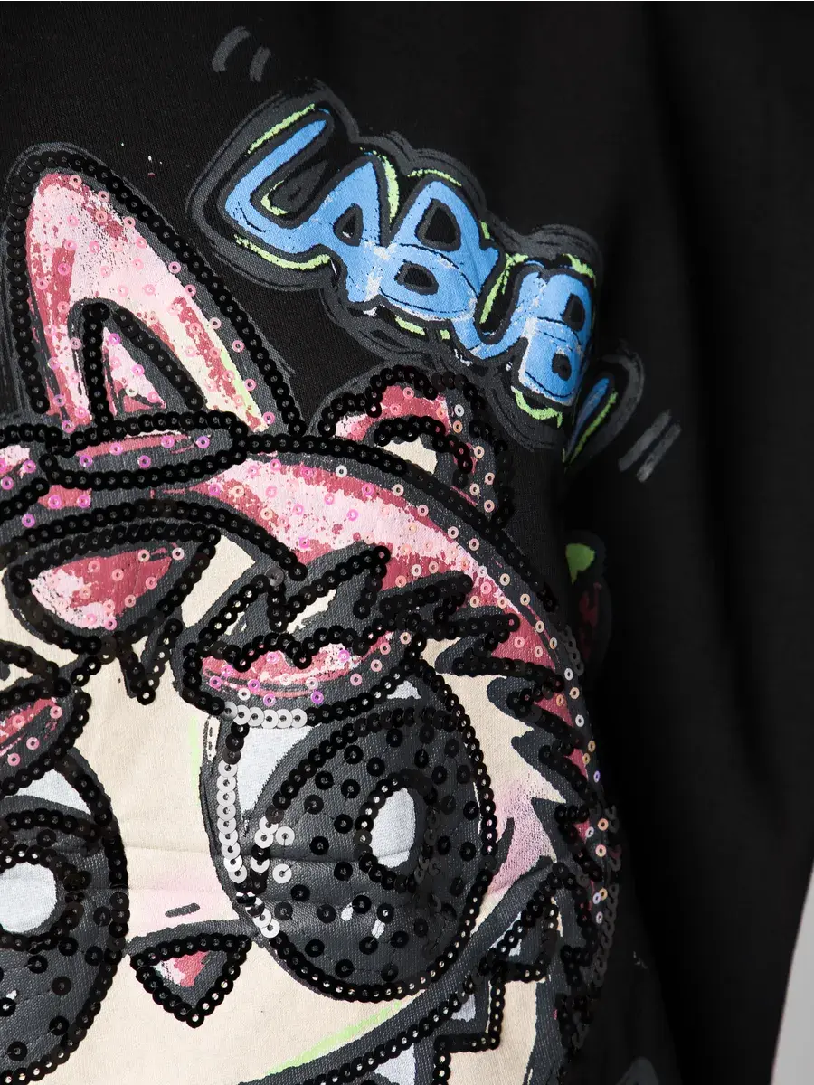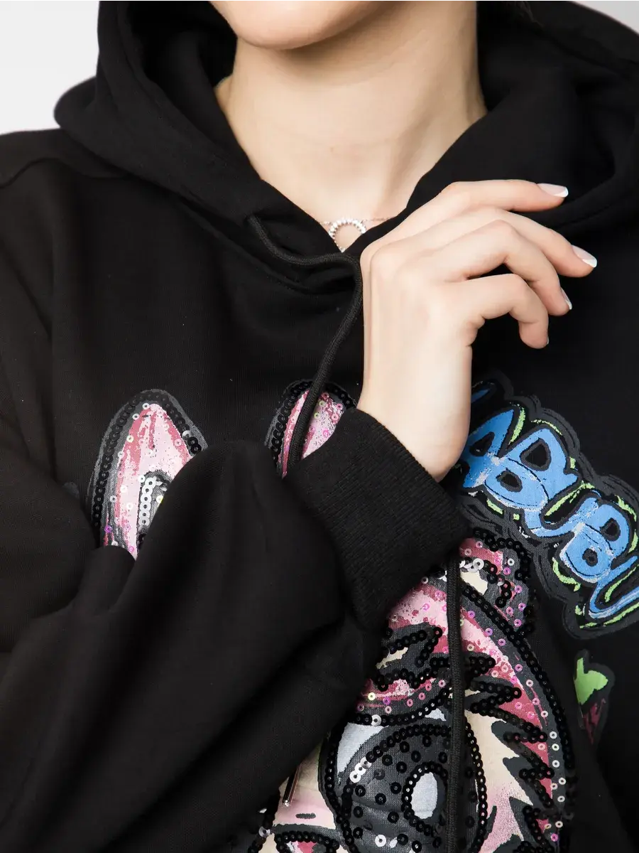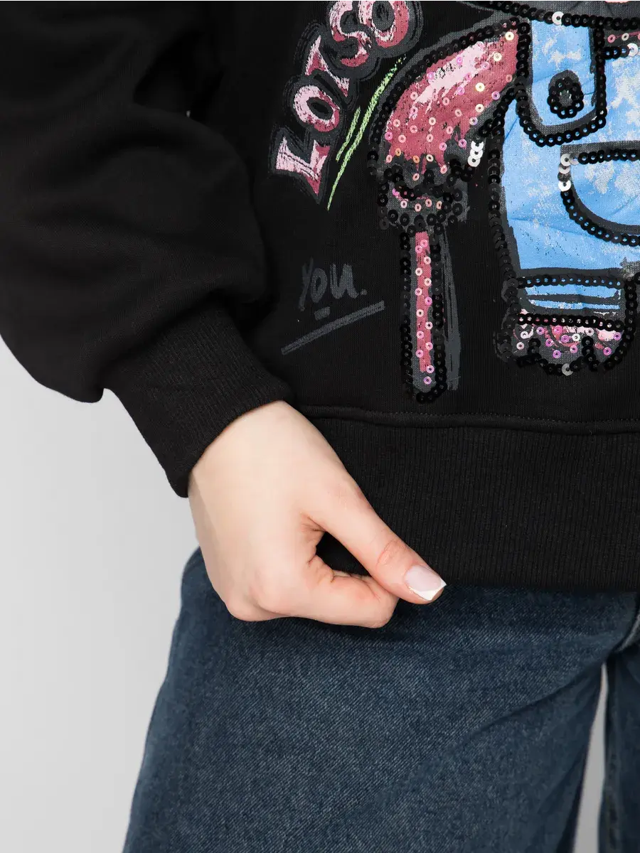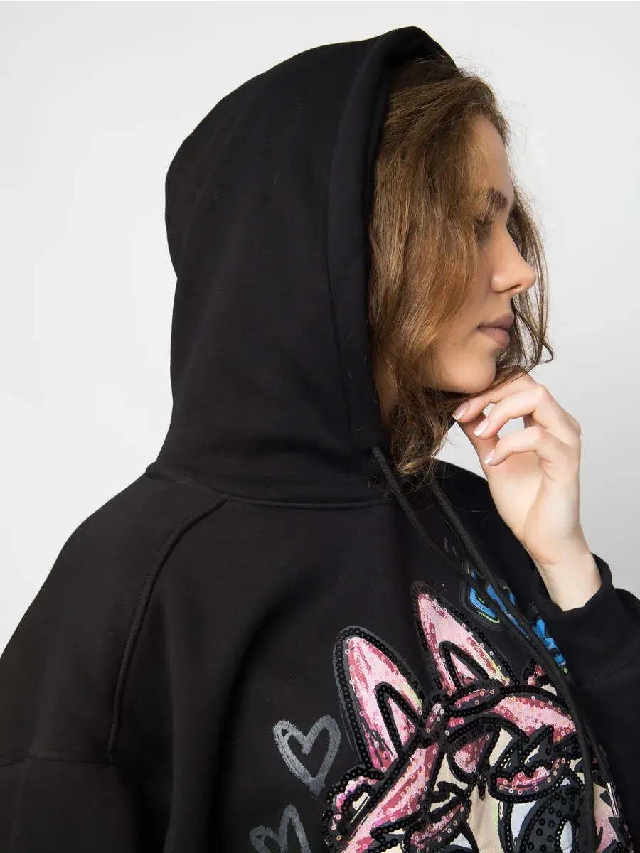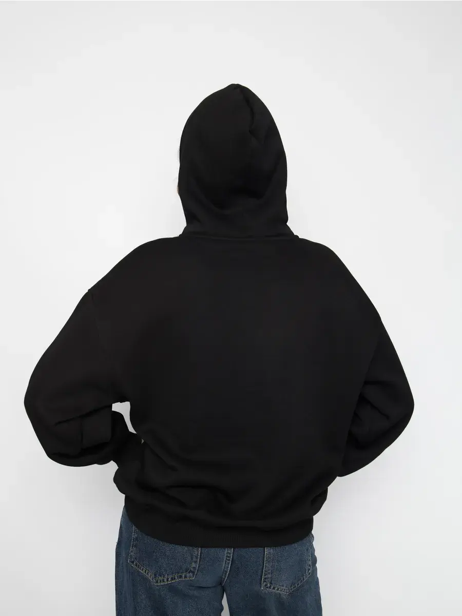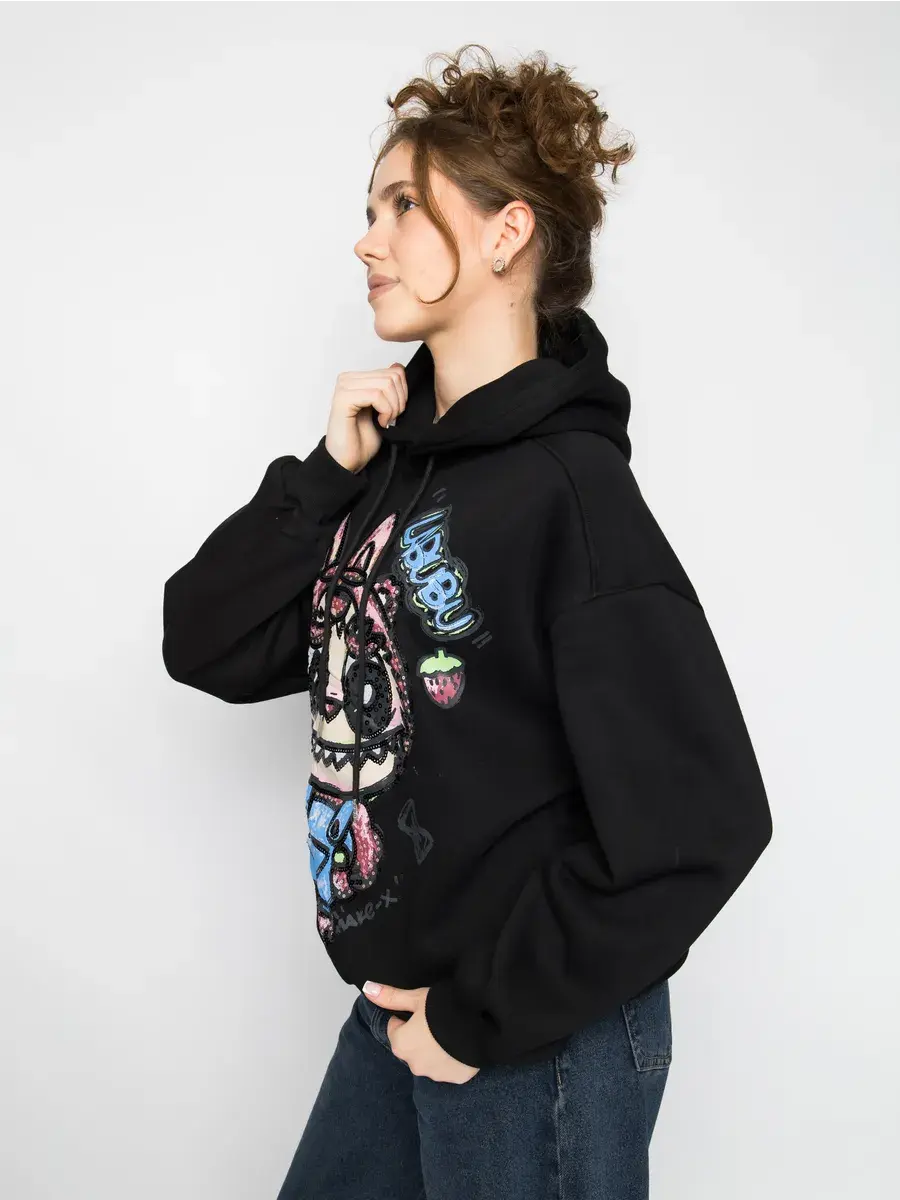 Толстовка женская утеплённая незаменимый вид одежды. Плотный трикотаж с утеплением внутри — мягкий флисовый начёс удерживает тепло и остаётся комфортным к телу. Свободная оверсайз посадка с заниженной линией плеч не сковывает движения, капюшон на кулиске защищает от ветра. Эластичные манжеты и плотная рибана по низу фиксируют посадку и помогают сохранять тепло, швы аккуратные и износостойкие. Центральный акцент — яркий принт-персонаж с долговечной отделкой: рисунок не трескается и сохраняет насыщенность после стирок. Материал неприхотлив в уходе: стирать при 30° наизнанку, быстро сохнет, не садится и не линяет. Модель хорошо сидит в привычном размере, даёт уют и чувство защищённости в прохладную погоду; подходит на осень, зиму и раннюю весну для города, учёбы и отдыха. Если ищете тёплое худи с начёсом и капюшоном в универсальном цвете, эта теплая толстовка станет практичным и стильным выбором.