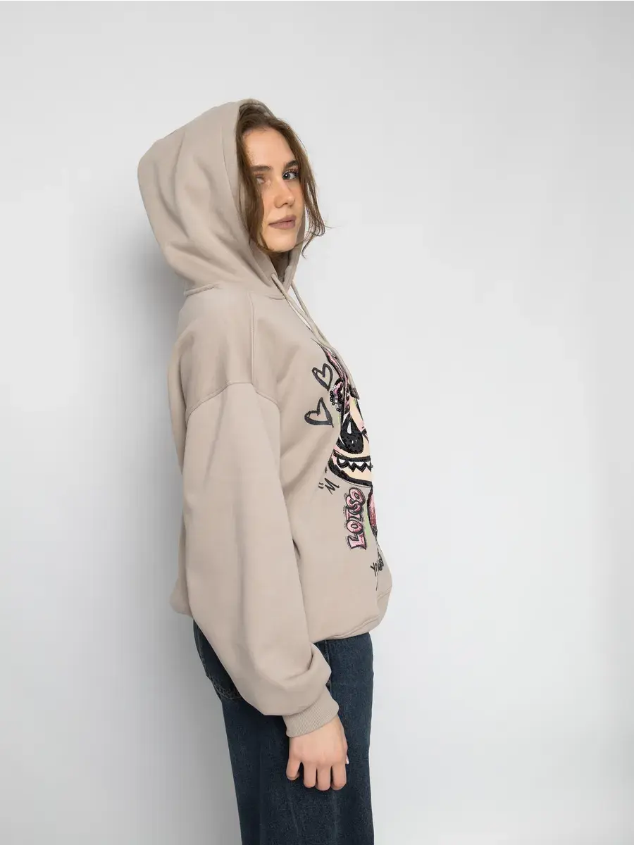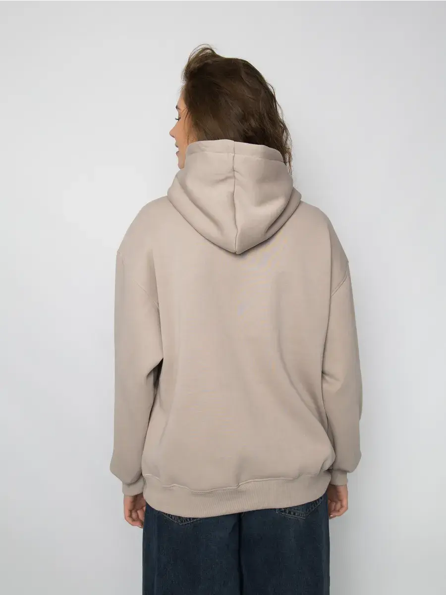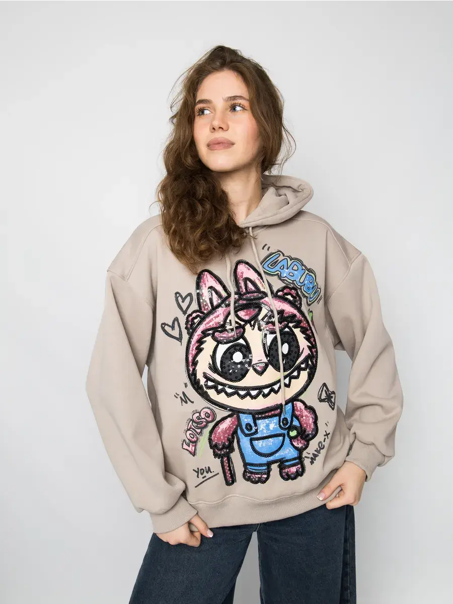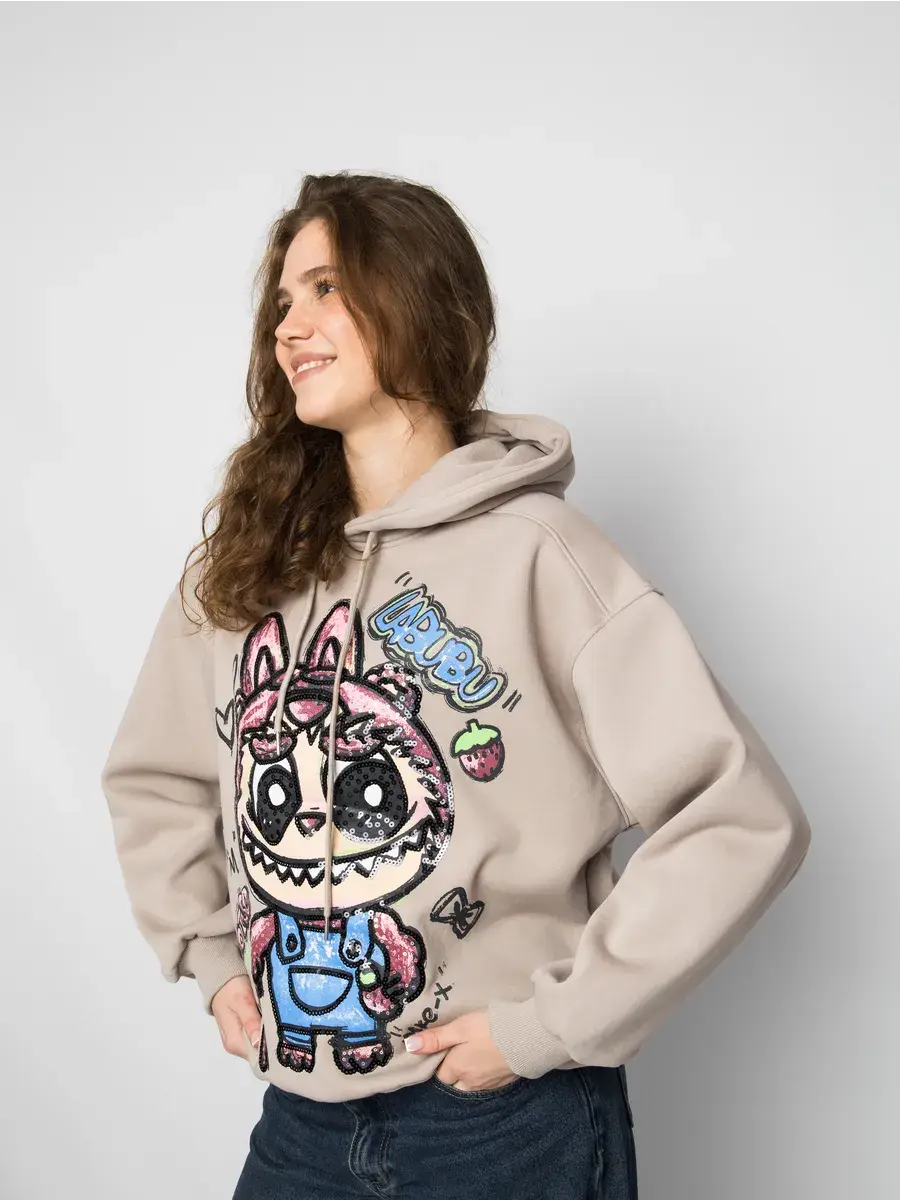 Толстовка женская утеплённая незаменимый вид одежды. Плотный трикотаж с утеплением внутри — мягкий флисовый начёс удерживает тепло и остаётся комфортным к телу. Свободная оверсайз посадка с заниженной линией плеч не сковывает движения, капюшон на кулиске защищает от ветра. Эластичные манжеты и плотная рибана по низу фиксируют посадку и помогают сохранять тепло, швы аккуратные и износостойкие. Центральный акцент — яркий принт-персонаж с долговечной отделкой: рисунок не трескается и сохраняет насыщенность после стирок. Материал неприхотлив в уходе: стирать при 30° наизнанку, быстро сохнет, не садится и не линяет. Модель хорошо сидит в привычном размере, даёт уют и чувство защищённости в прохладную погоду; подходит на осень, зиму и раннюю весну для города, учёбы и отдыха. Если ищете тёплое худи с начёсом и капюшоном в универсальном цвете, эта теплая толстовка станет практичным и стильным выбором.