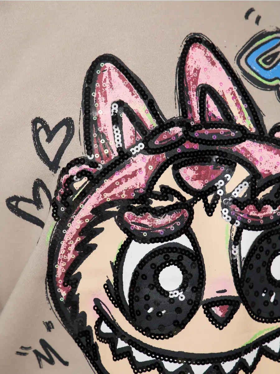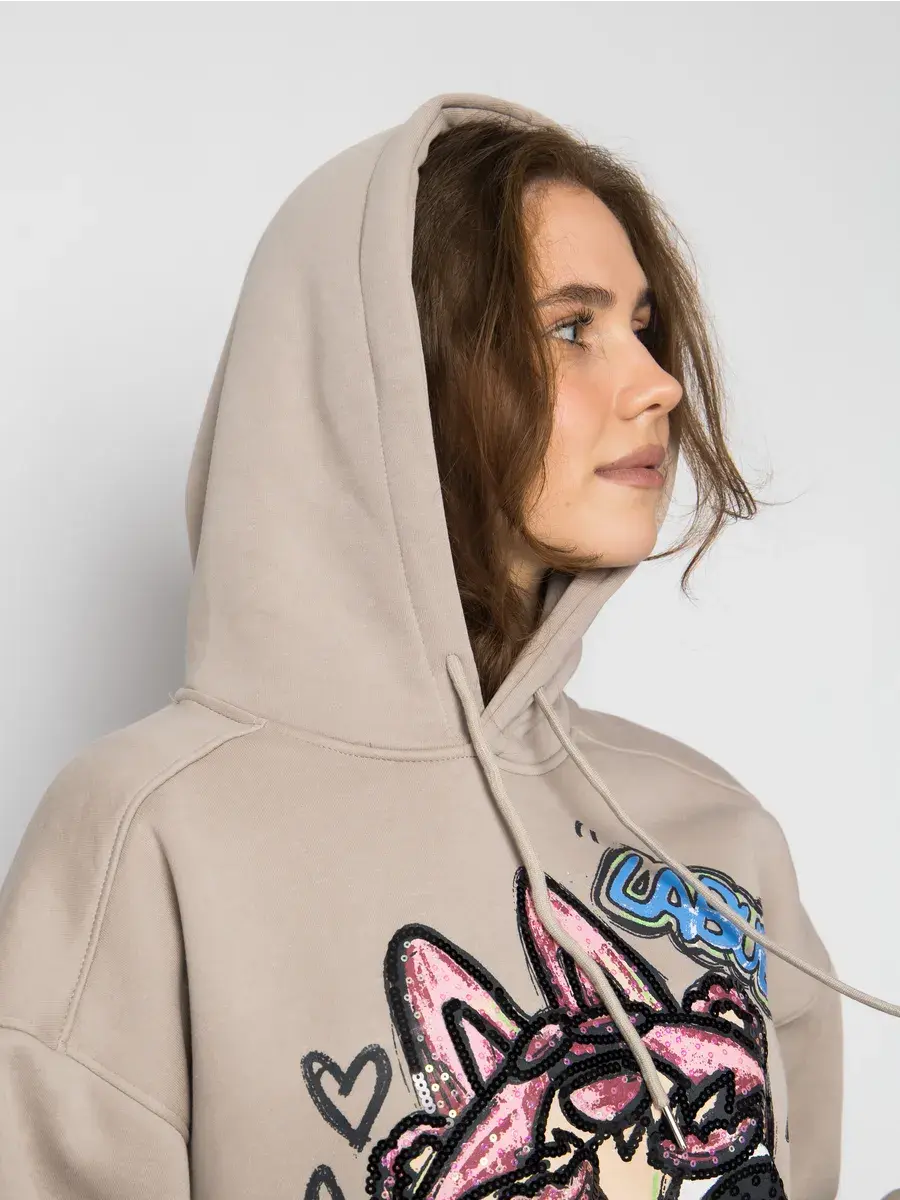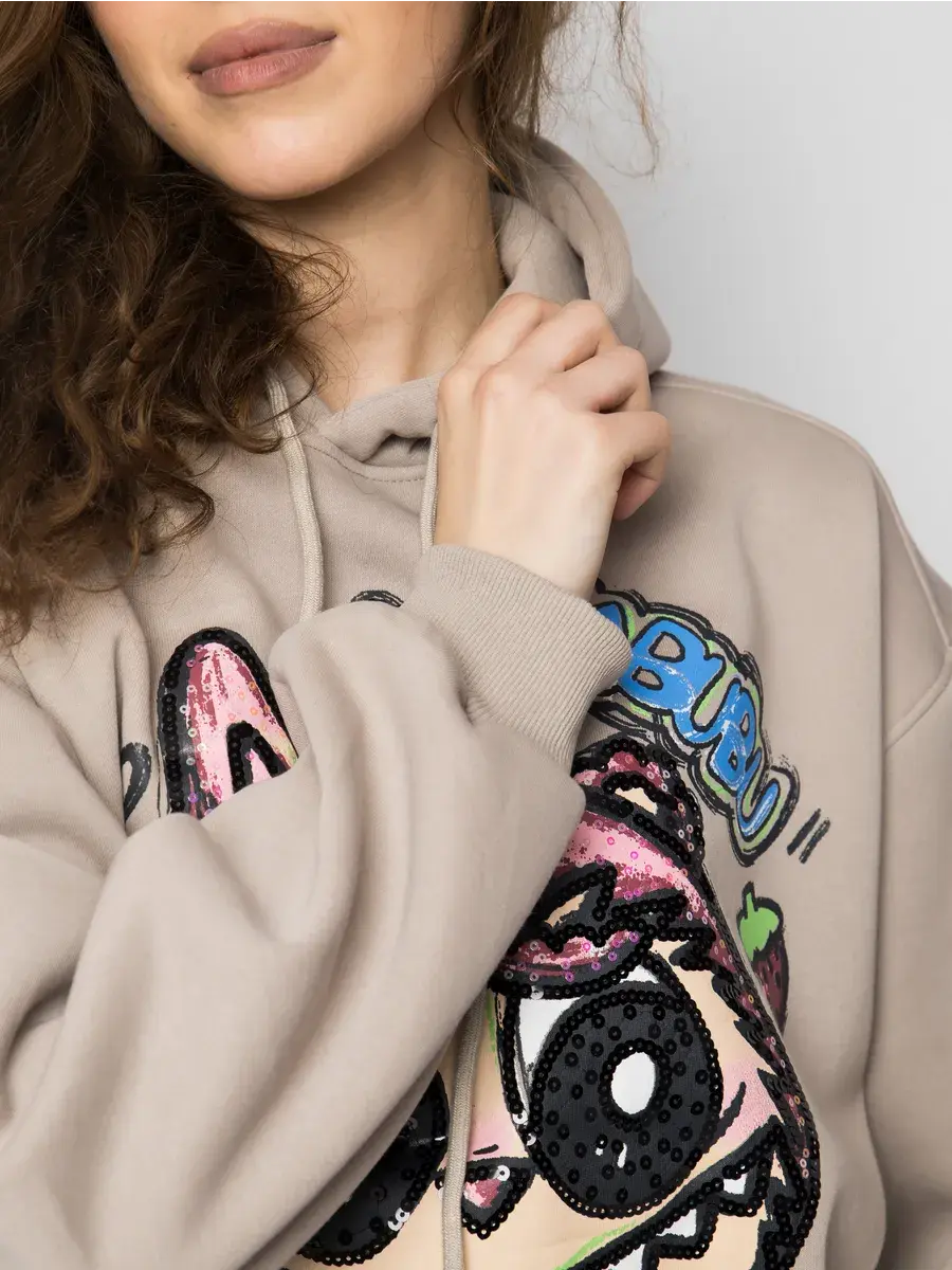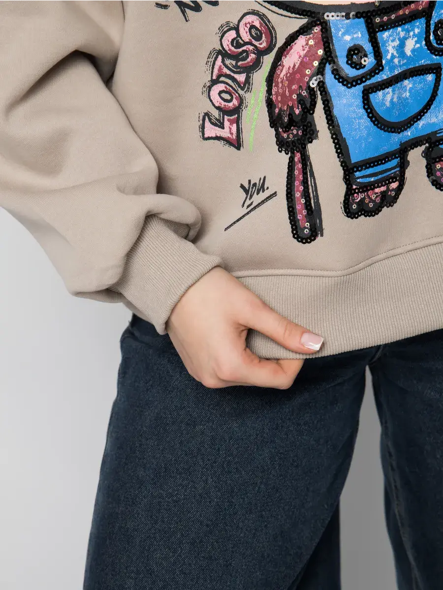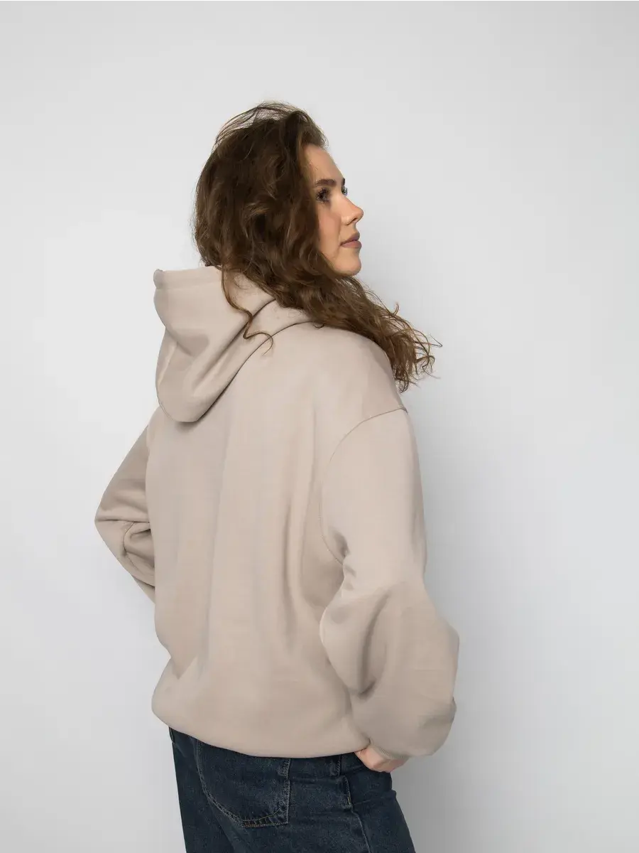 Толстовка женская утеплённая незаменимый вид одежды. Плотный трикотаж с утеплением внутри — мягкий флисовый начёс удерживает тепло и остаётся комфортным к телу. Свободная оверсайз посадка с заниженной линией плеч не сковывает движения, капюшон на кулиске защищает от ветра. Эластичные манжеты и плотная рибана по низу фиксируют посадку и помогают сохранять тепло, швы аккуратные и износостойкие. Центральный акцент — яркий принт-персонаж с долговечной отделкой: рисунок не трескается и сохраняет насыщенность после стирок. Материал неприхотлив в уходе: стирать при 30° наизнанку, быстро сохнет, не садится и не линяет. Модель хорошо сидит в привычном размере, даёт уют и чувство защищённости в прохладную погоду; подходит на осень, зиму и раннюю весну для города, учёбы и отдыха. Если ищете тёплое худи с начёсом и капюшоном в универсальном цвете, эта теплая толстовка станет практичным и стильным выбором.