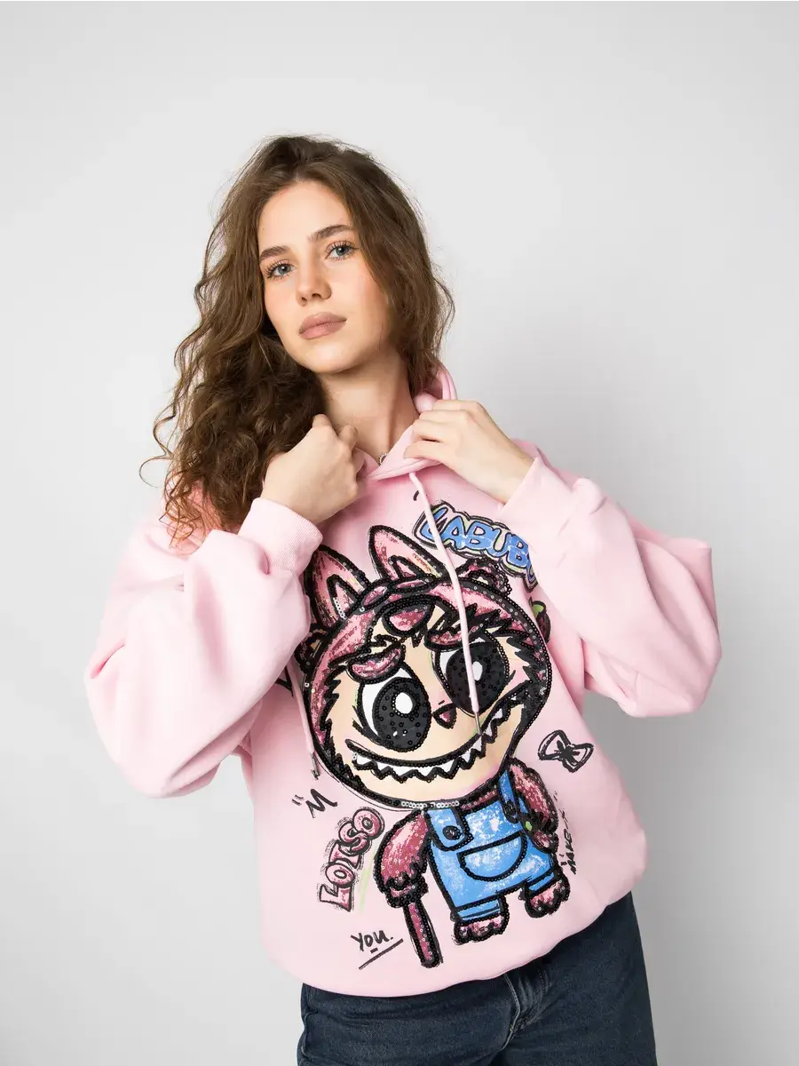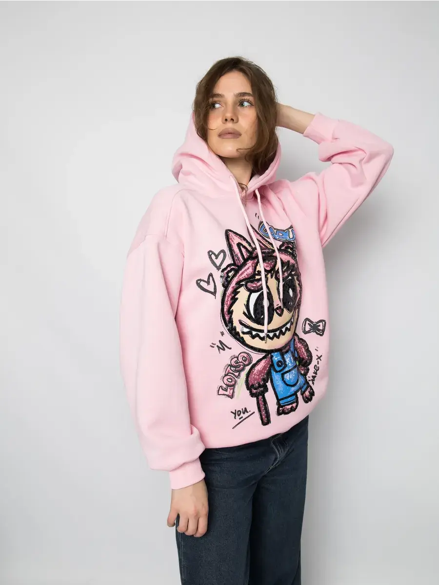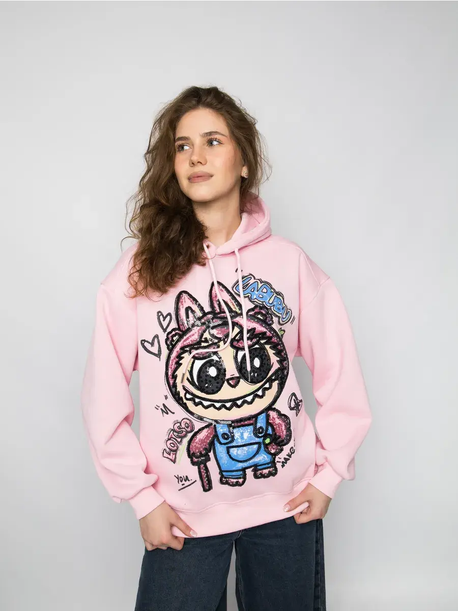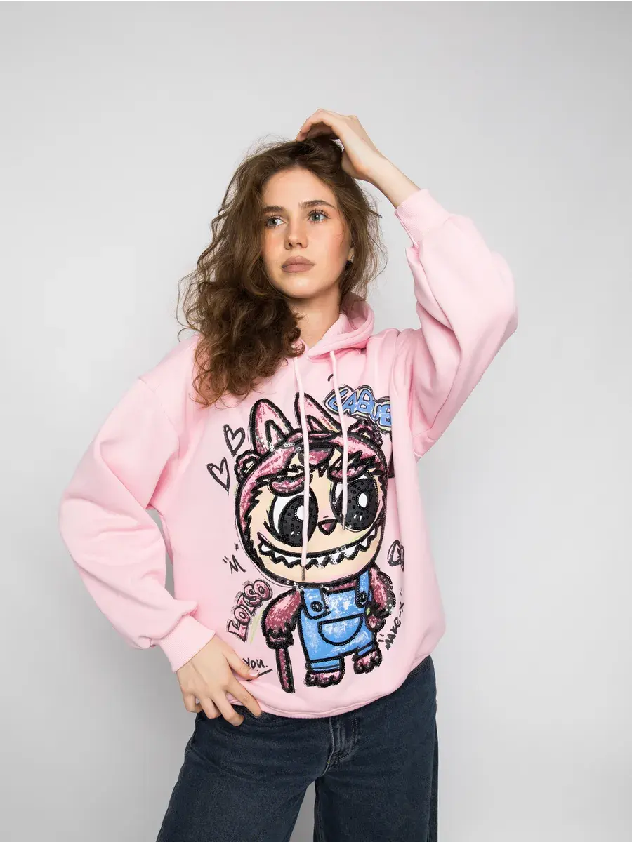 Толстовка женская утеплённая незаменимый вид одежды. Плотный трикотаж с утеплением внутри — мягкий флисовый начёс удерживает тепло и остаётся комфортным к телу. Свободная оверсайз посадка с заниженной линией плеч не сковывает движения, капюшон на кулиске защищает от ветра. Эластичные манжеты и плотная рибана по низу фиксируют посадку и помогают сохранять тепло, швы аккуратные и износостойкие. Центральный акцент — яркий принт-персонаж с долговечной отделкой: рисунок не трескается и сохраняет насыщенность после стирок. Материал неприхотлив в уходе: стирать при 30° наизнанку, быстро сохнет, не садится и не линяет. Модель хорошо сидит в привычном размере, даёт уют и чувство защищённости в прохладную погоду; подходит на осень, зиму и раннюю весну для города, учёбы и отдыха. Если ищете тёплое худи с начёсом и капюшоном в универсальном цвете, эта теплая толстовка станет практичным и стильным выбором.