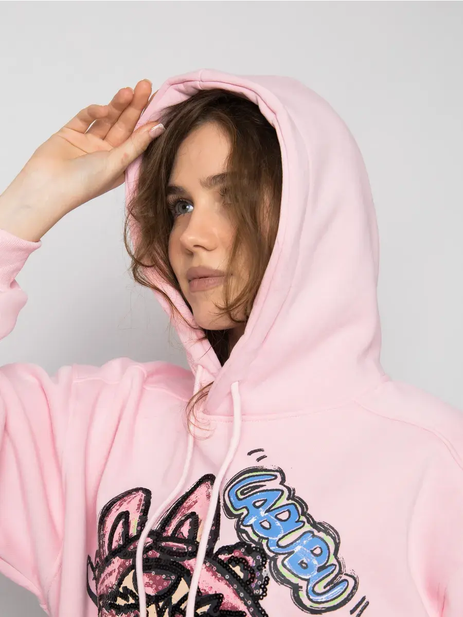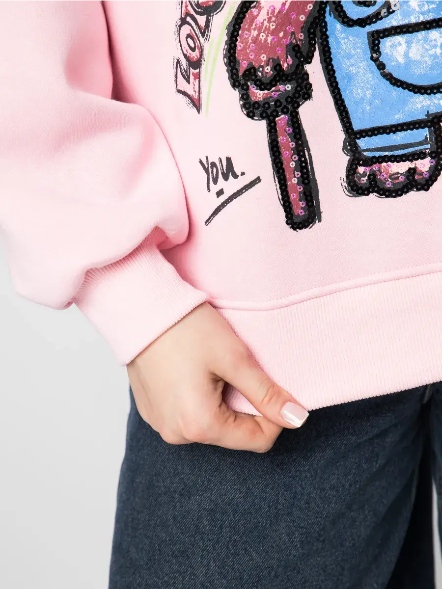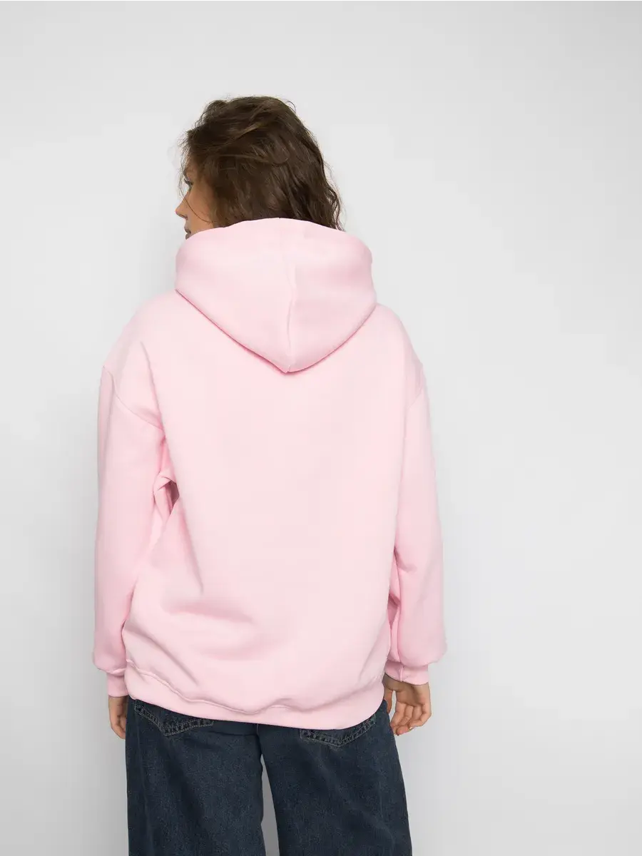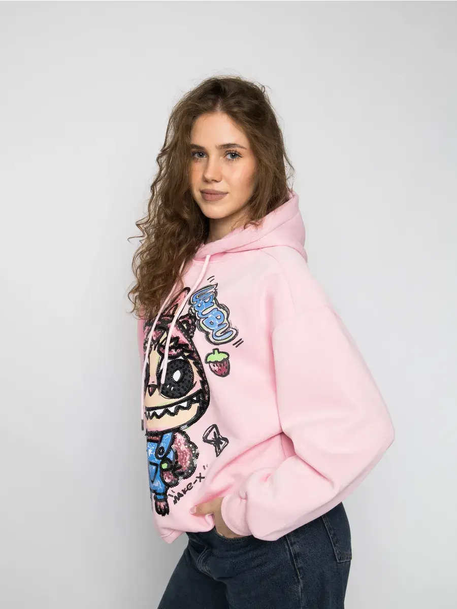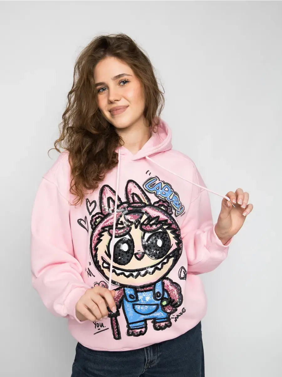 Толстовка женская утеплённая незаменимый вид одежды. Плотный трикотаж с утеплением внутри — мягкий флисовый начёс удерживает тепло и остаётся комфортным к телу. Свободная оверсайз посадка с заниженной линией плеч не сковывает движения, капюшон на кулиске защищает от ветра. Эластичные манжеты и плотная рибана по низу фиксируют посадку и помогают сохранять тепло, швы аккуратные и износостойкие. Центральный акцент — яркий принт-персонаж с долговечной отделкой: рисунок не трескается и сохраняет насыщенность после стирок. Материал неприхотлив в уходе: стирать при 30° наизнанку, быстро сохнет, не садится и не линяет. Модель хорошо сидит в привычном размере, даёт уют и чувство защищённости в прохладную погоду; подходит на осень, зиму и раннюю весну для города, учёбы и отдыха. Если ищете тёплое худи с начёсом и капюшоном в универсальном цвете, эта теплая толстовка станет практичным и стильным выбором.